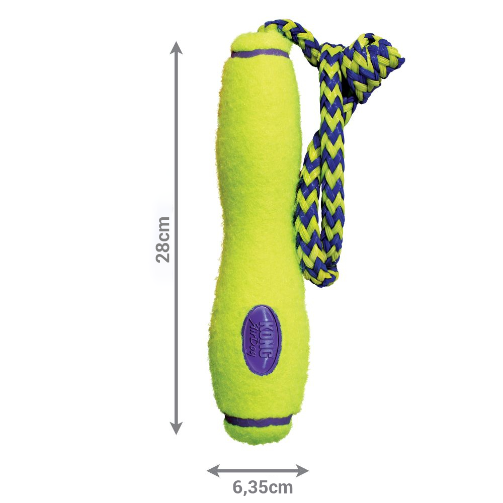 The KONG AirDog Fetch Stick with Rope is a tennis-style, floating fetch toy with a rope for long throws, loved by medium and large breed dogs. The KONG AirDog Fetch Stick is shaped like a stick and covered with high-quality, soft polyester felt. Unlike the felt found in regular tennis balls, the polyester felt doesn't abrade your dog's teeth or irritate their gums or palate. Thanks to its rubber interior, the stick bounces well on hard surfaces, providing your pets with plenty of healthy and engaging play. What's more, it floats on water! This is an additional reason to play and makes your dog's dreams come true. The strong nylon rope allows you to throw the fetch far and easily retrieve it from your dog. Have fun playing with it, as the vibrant yellow color will make it easier to find the stick in the field.