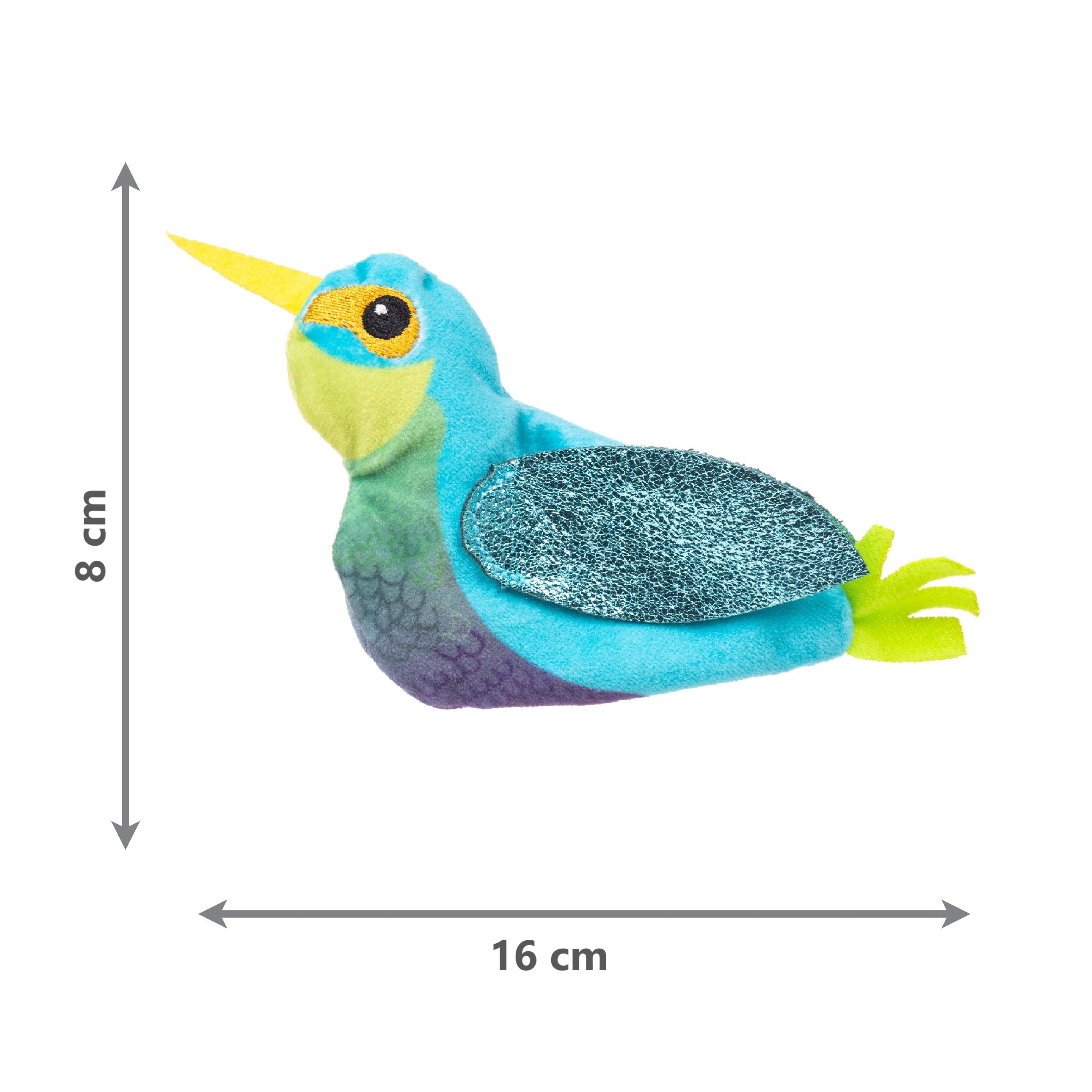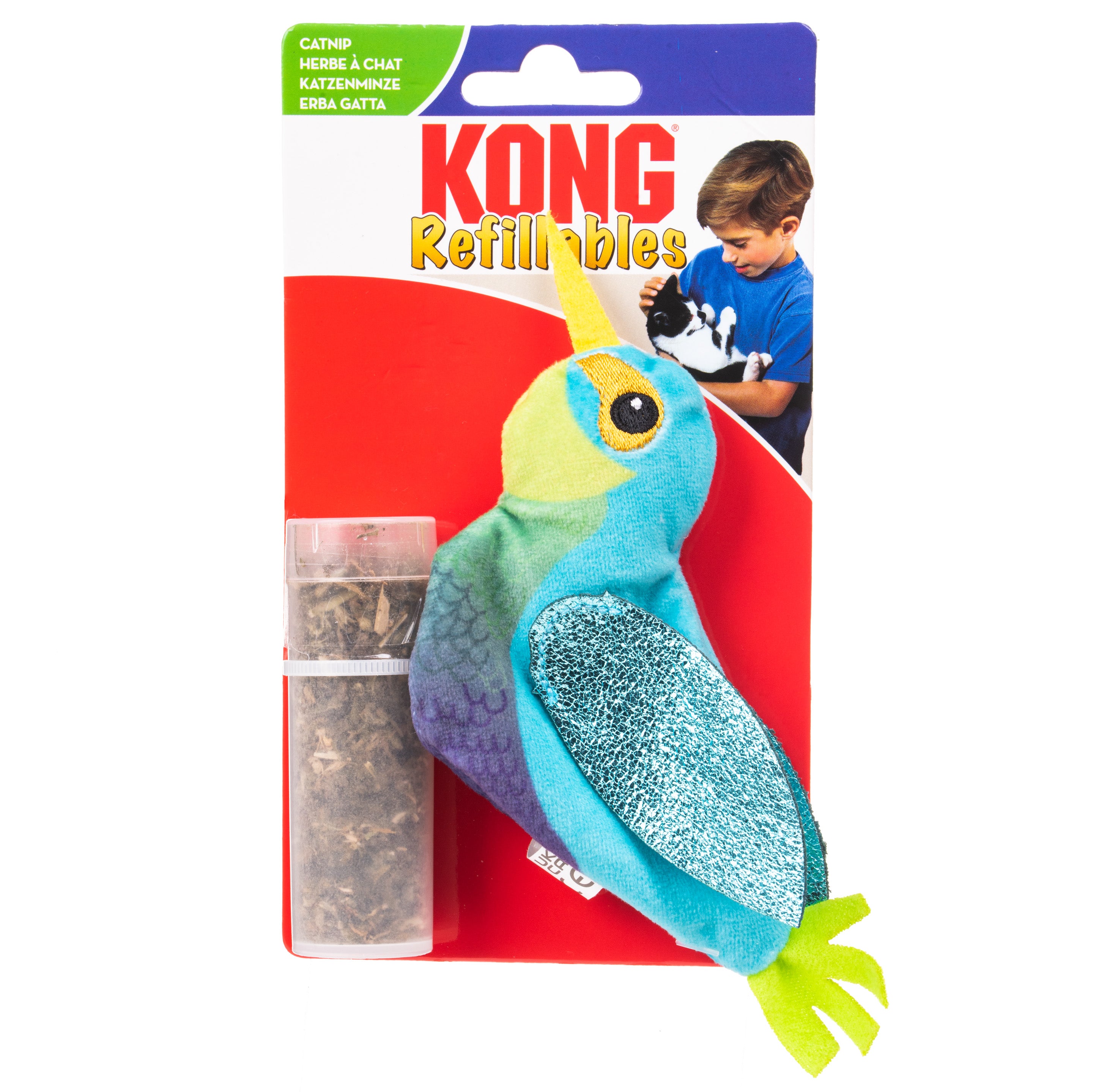 The KONG Cat Refillables Catnip Hummingbird is a small catnip toy for cats. A soft, shiny hummingbird with a supply of catnip for extended play. The KONG Cat Refillable is the best cat toy! KONG knows what tigers like best. This small, lovable bird with intriguing wings and a plush tail stimulates cats' hunting instincts, and the catnip provides tons of fun. The toy's small size is perfect for wild romps, "pouncing" and tossing. The plush toy has no filling in its belly, but has a Velcro-fastened pocket. If you like, you can fill it with the highest quality KONG catnip. A supply is included with the toy.
