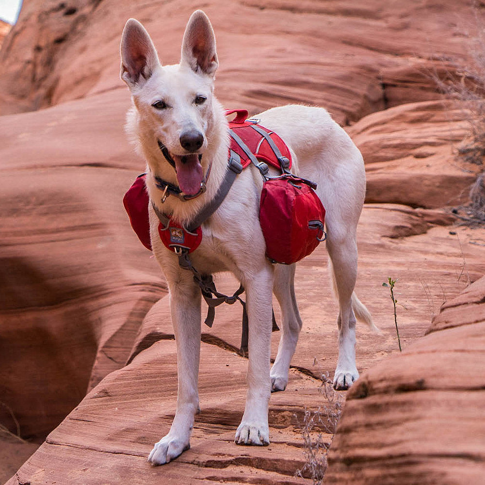 Remember to evenly distribute the contents of the panniers. Each dog's load capacity is individual and depends on its size, build, and physical fitness. The panniers should not exceed 20% of the dog's body weight. If you're just starting out with saddlebags, it's a good idea to get your dog used to carrying them by starting your first walks with empty saddlebags and gradually increasing the load.