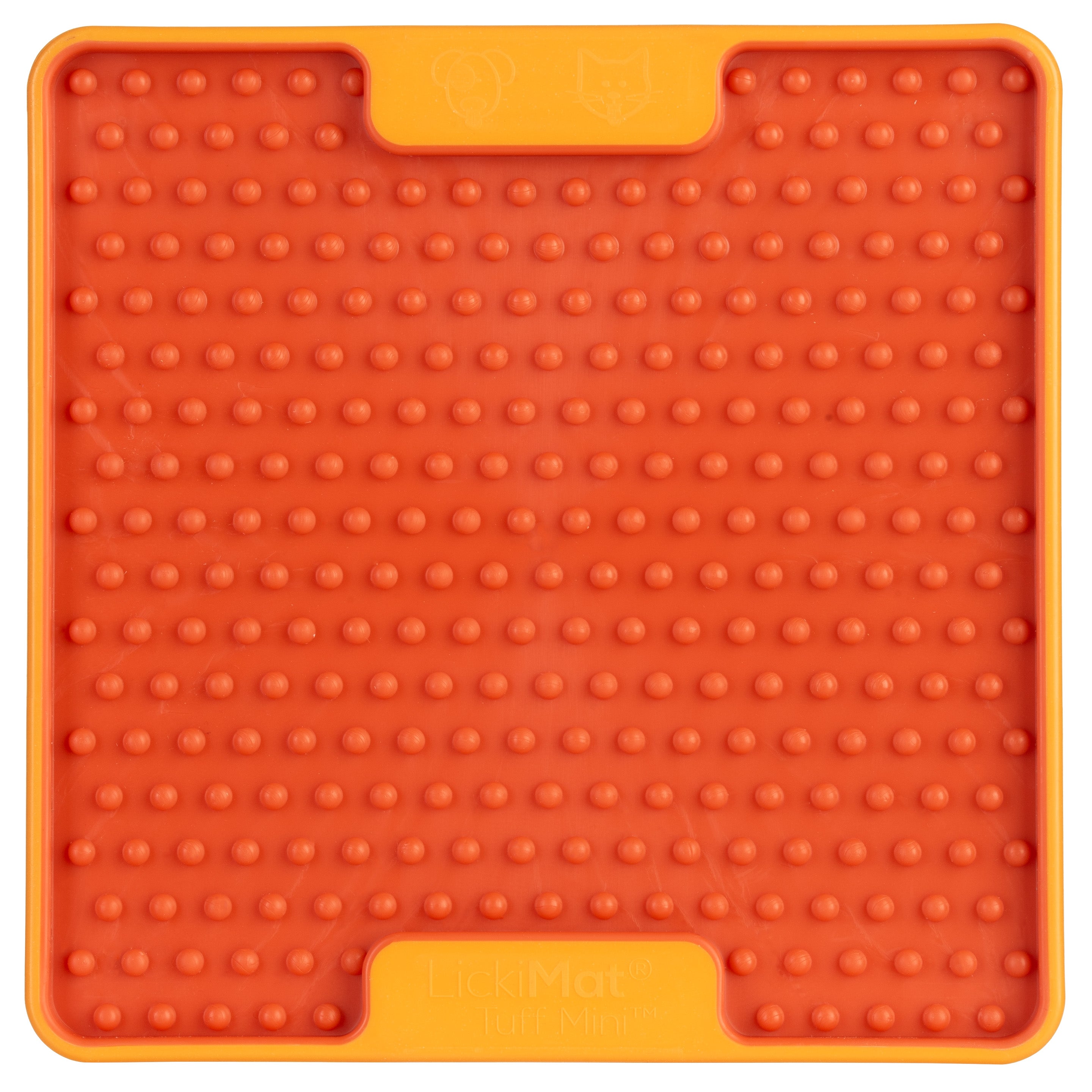 The LickiMat Mini Tuff Soother licking mat for small dogs, in beautiful, vibrant colors and an interesting design, is a way to serve meals in an attractive way. You can microwave it and heat up a meal. By placing it, along with its contents, in the freezer, you'll provide your pet with plenty of fun and refreshment on hot summer days. You can place a less-than-tasty medication or dietary supplement on it, and your pet, busy licking the tasty contents, will swallow it without noticing. It's ideal for serving food in solid, soft, or liquid form. It's perfect for thick and sticky treats like pates, wet food, special dog peanut butter, yogurt, mashed banana, or soggy cookies. The mat's nubs massage your pet's tongue, providing additional sensory experiences. To further enhance the fun, you can freeze the contents on hot summer days. And if your dog doesn't like cold food, you can gently warm it in the microwave. Non-slip feet prevent the mat from slipping. The mat will keep your pet occupied, and prolonged licking will release hormones responsible for well-being and help them cope with stress and anxiety. It will calm even the wildest and most energetic dog. It's also a great way to have fun. Recommended by veterinarians, behaviorists, and breeders worldwide! By serving food on the LickiMat, you're sure to notice a change in your dog's behavior. Licking and sniffing activities have a calming and soothing effect on your dog's nervous system. They tire your pet out much faster than other forms of activity. This is especially important if your pet uses up energy by, for example, destroying objects around them. It's also an ideal product for four-legged sweet tooths, often struggling with excess weight. It allows you to serve smaller amounts of food, and your pet won't even notice, as the meal lasts longer than a traditional meal. Fewer calories per serving will help combat excess weight. Licking food off the mat stimulates salivary glands to produce more saliva. This increases appetite in picky eaters and helps keep the animal's teeth, gums, and tongue in good condition. The mat prevents food debris from remaining in your pet's mouth, thus eliminating the problem of bacterial growth and unpleasant odor.
