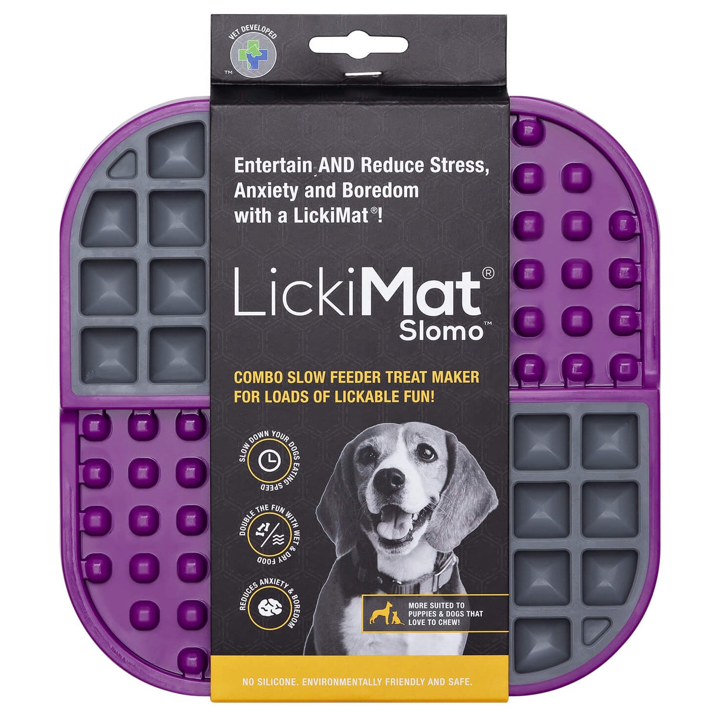 The LickiMat Slomo dog licking mat provides an exciting activity for pets, helping to reduce anxiety and stress while promoting dental health.
