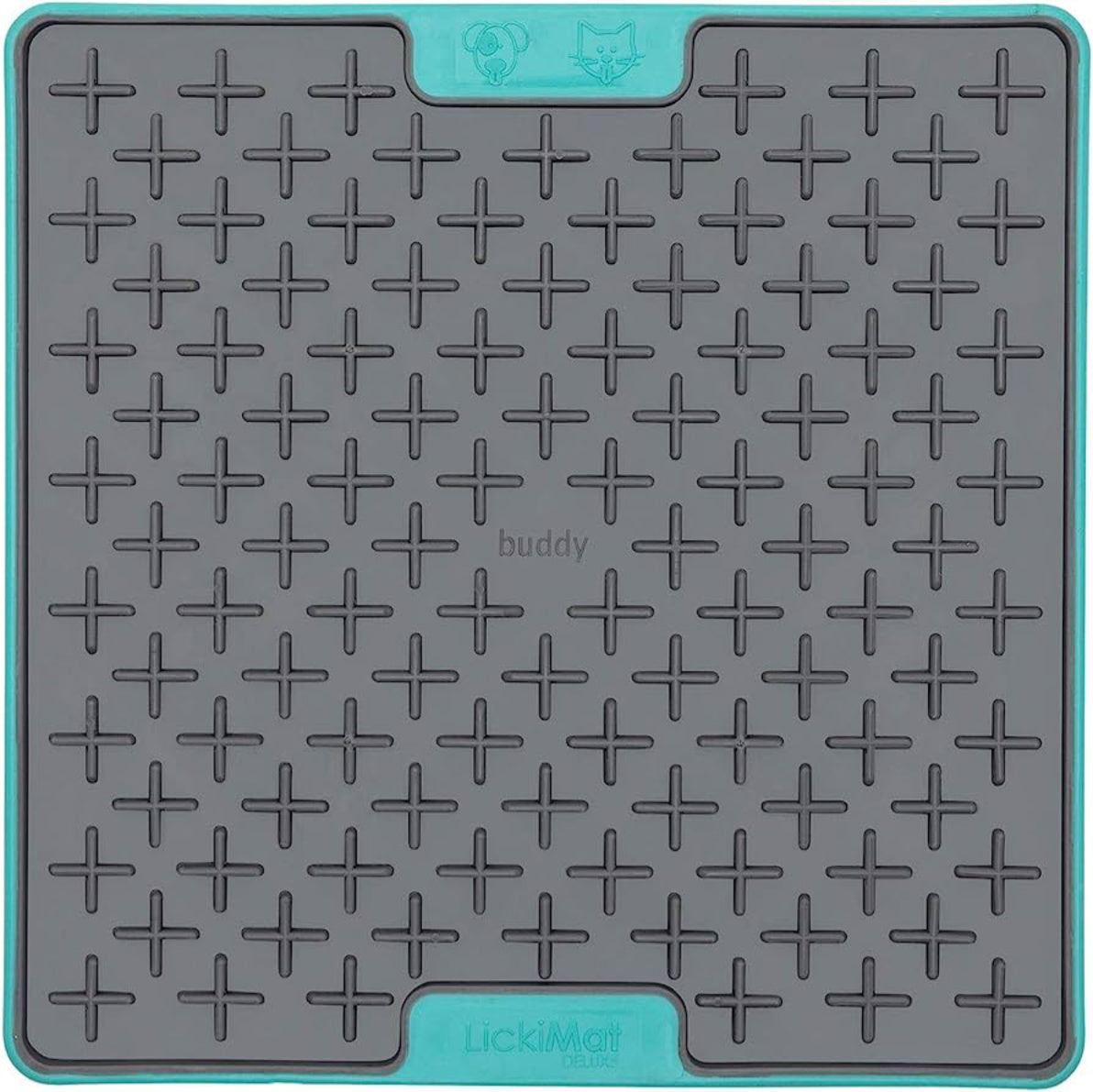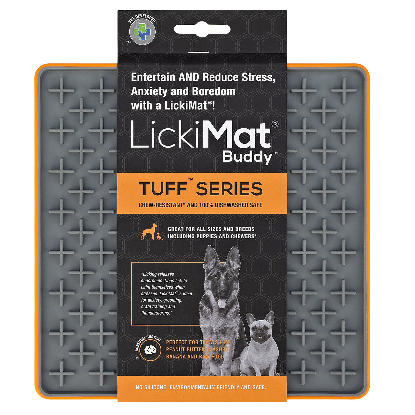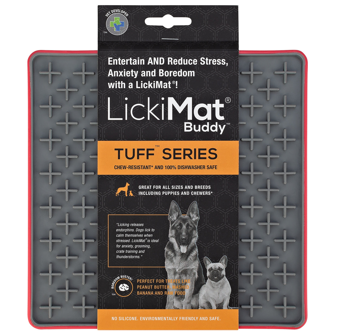 The LickiMat Tuff Buddy licking mat for dogs and cats is a veterinarian-recommended tool that helps reduce anxiety and boredom while promoting dental hygiene.