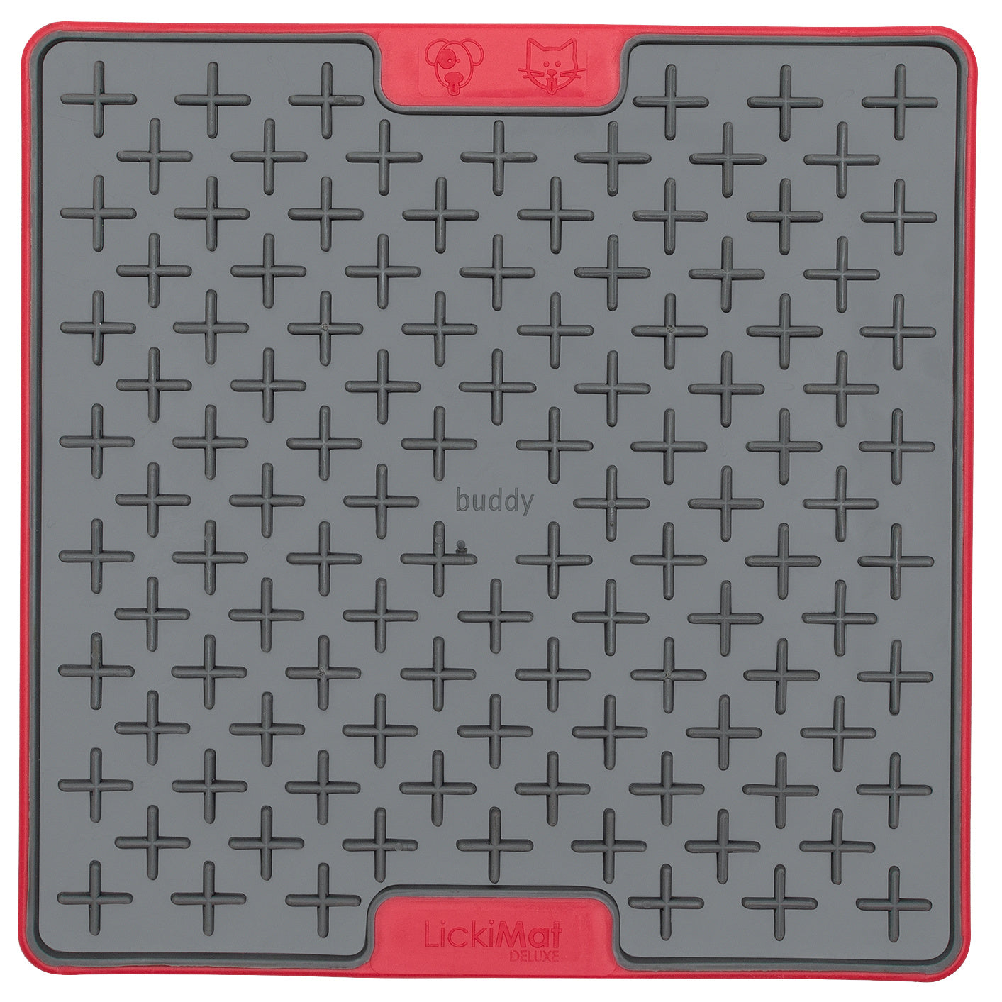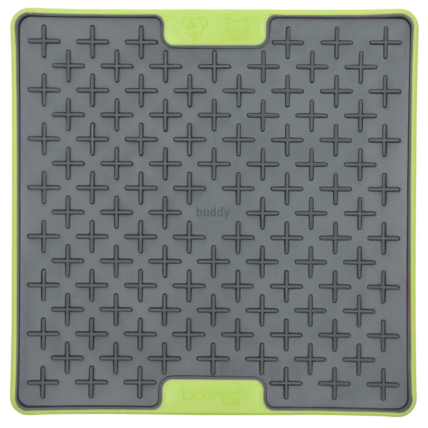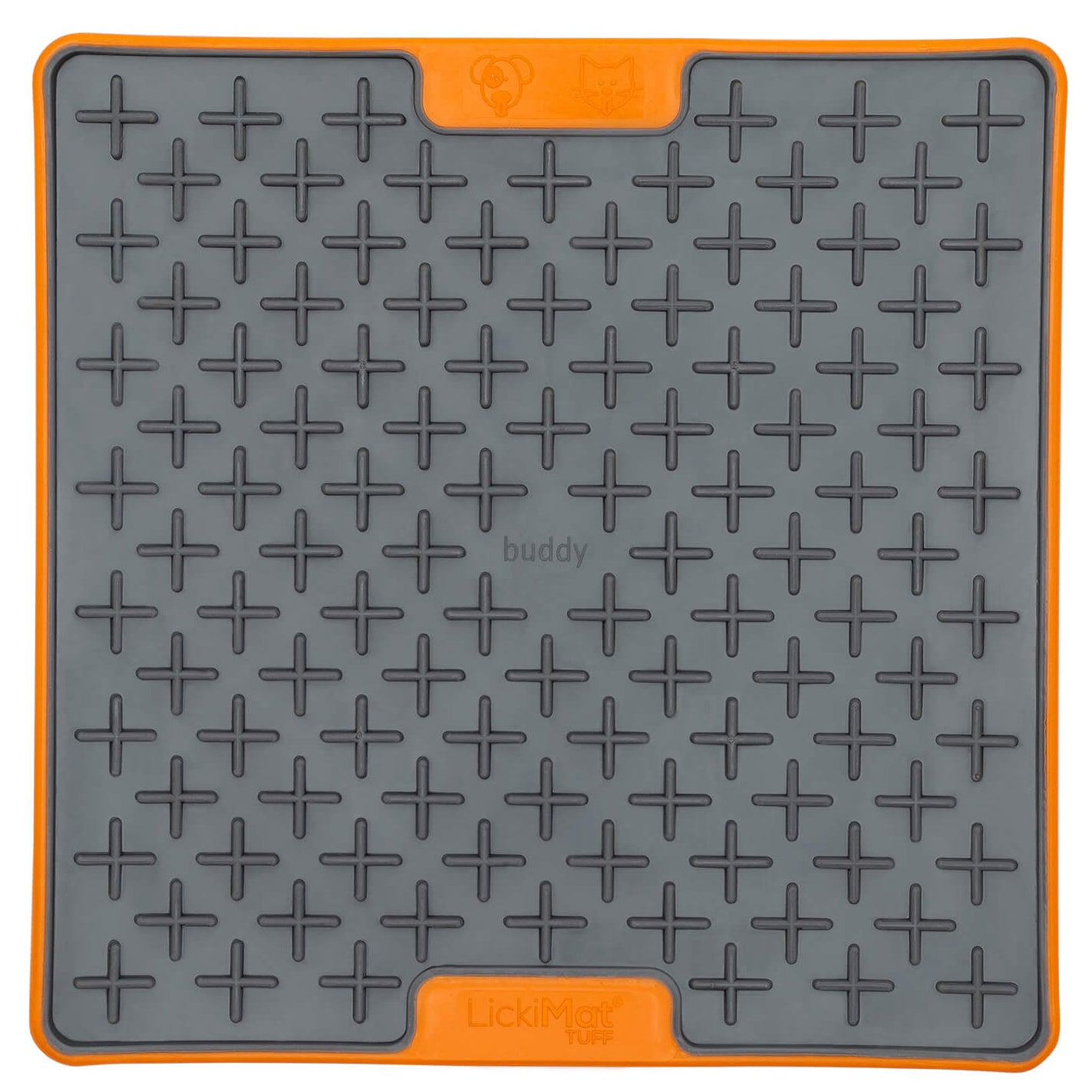 The LickiMat Tuff Buddy licking mat for dogs and cats is a veterinarian-recommended tool that helps reduce anxiety and boredom while promoting dental hygiene.