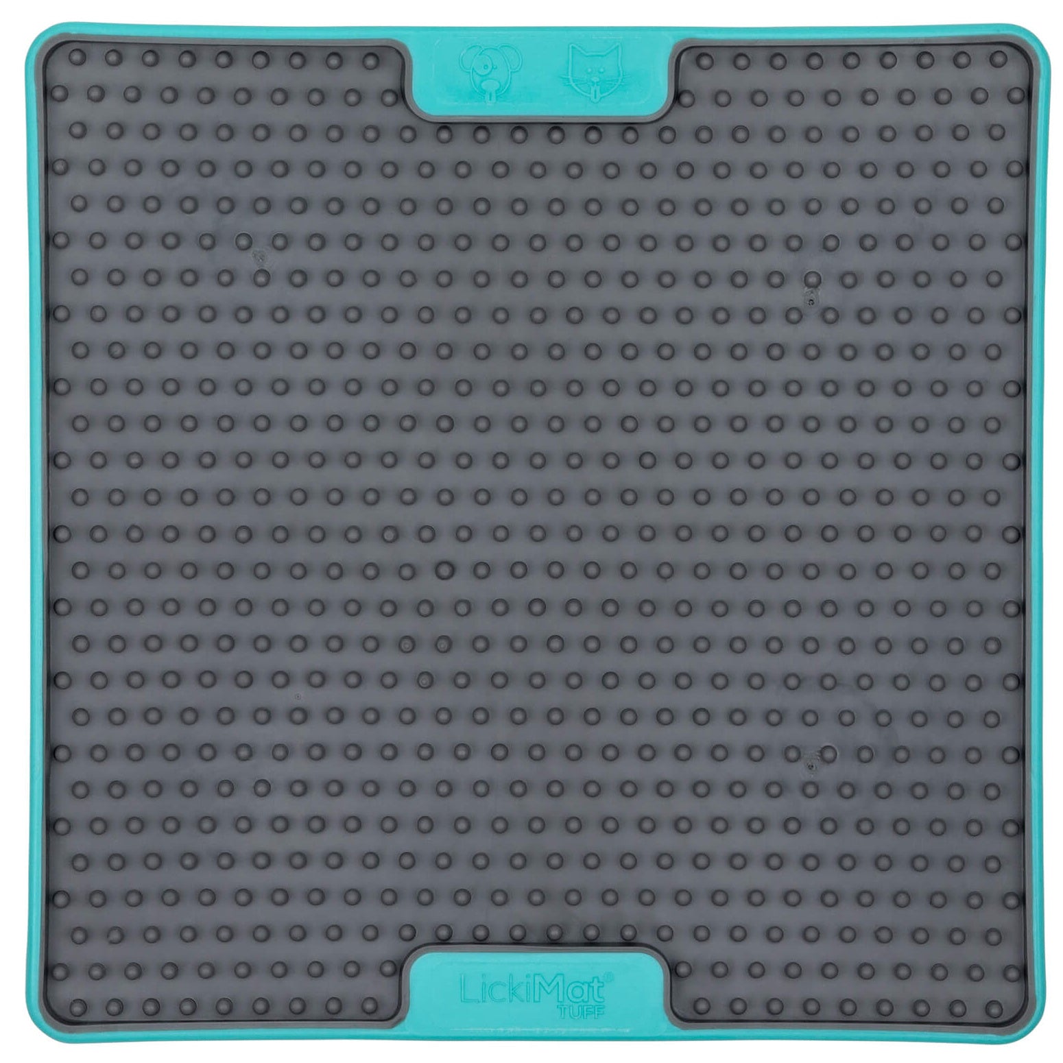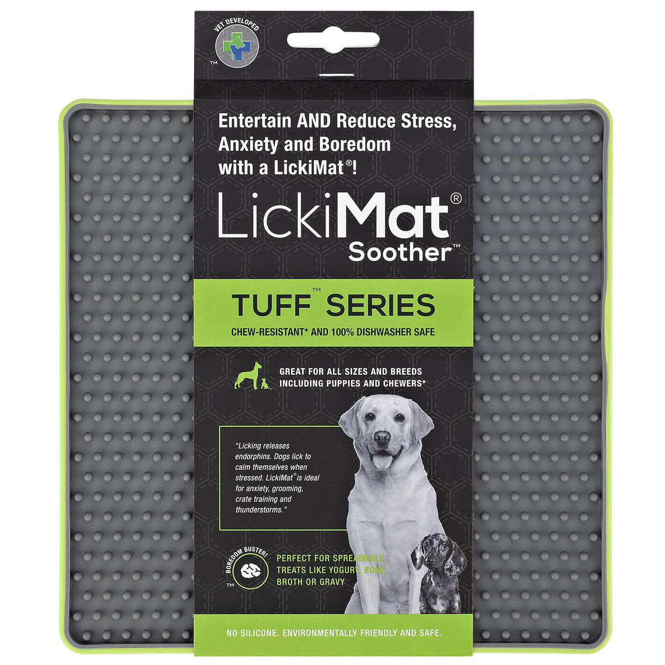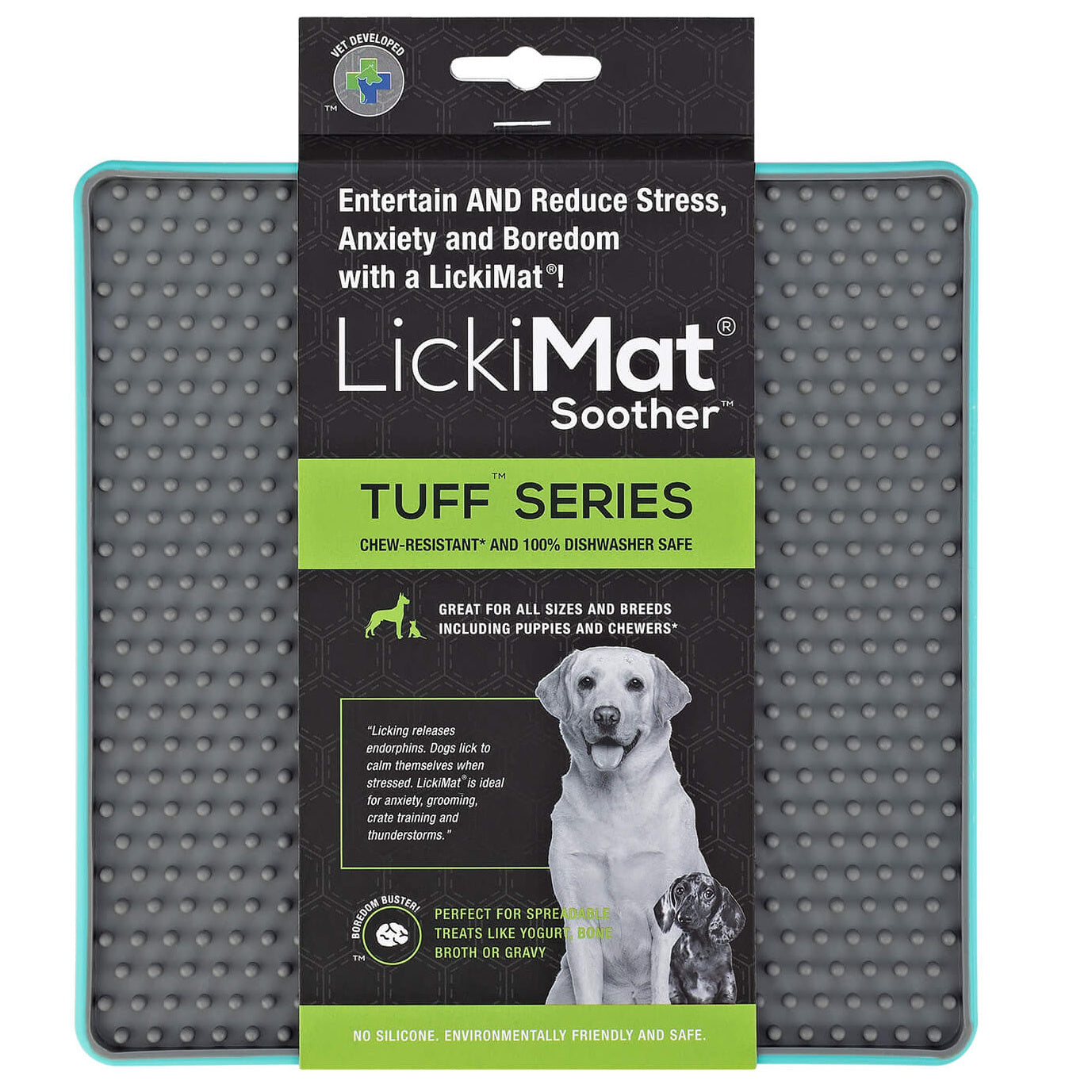 The LickiMat Tuff Soother dog licking mat provides an exciting activity for pets, helping to reduce anxiety and promote well-being through prolonged licking.