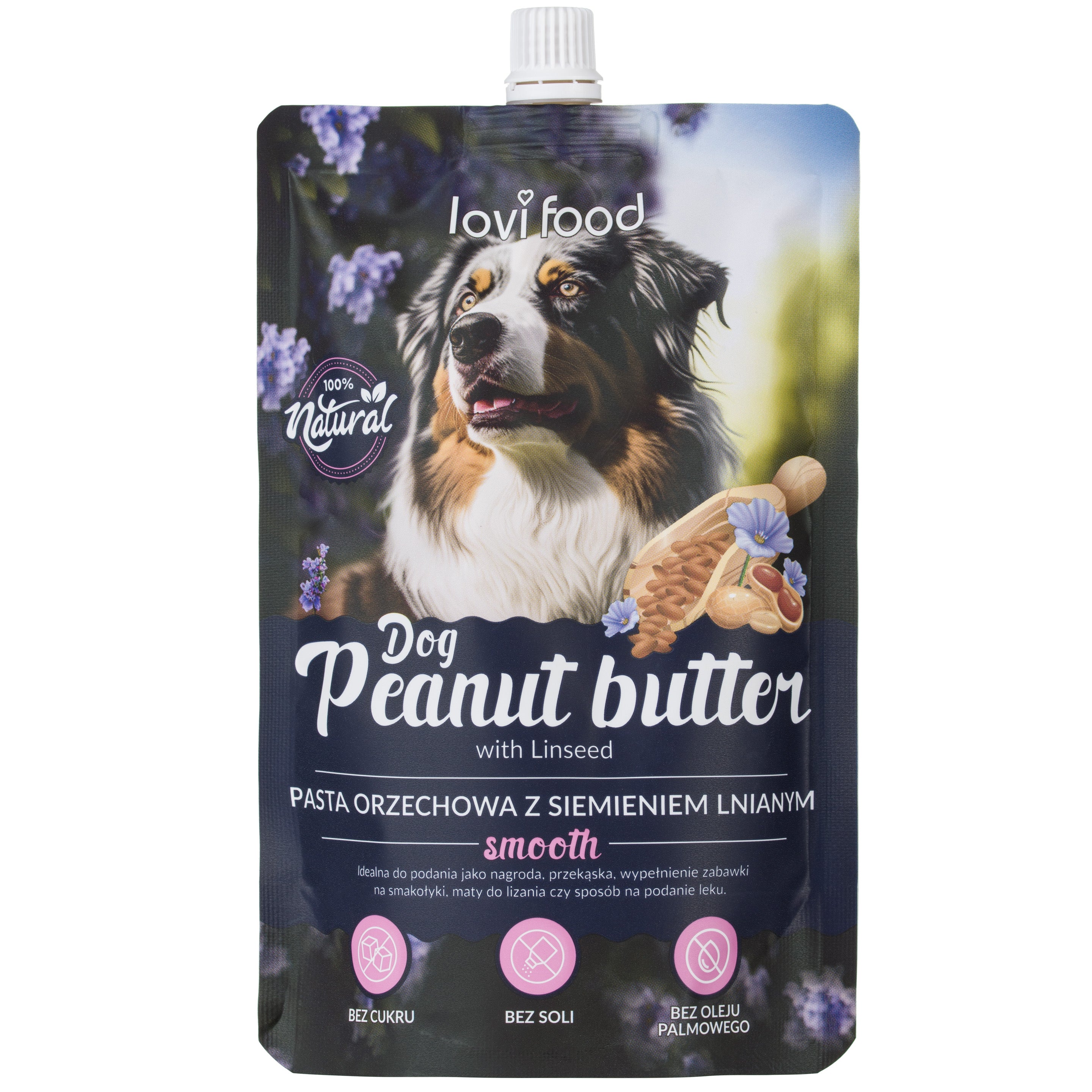 Lovi Food Peanut Butter with Linseed is a delicious, vegan treat for dogs and cats, rich in nutrients and perfect for health and beauty.