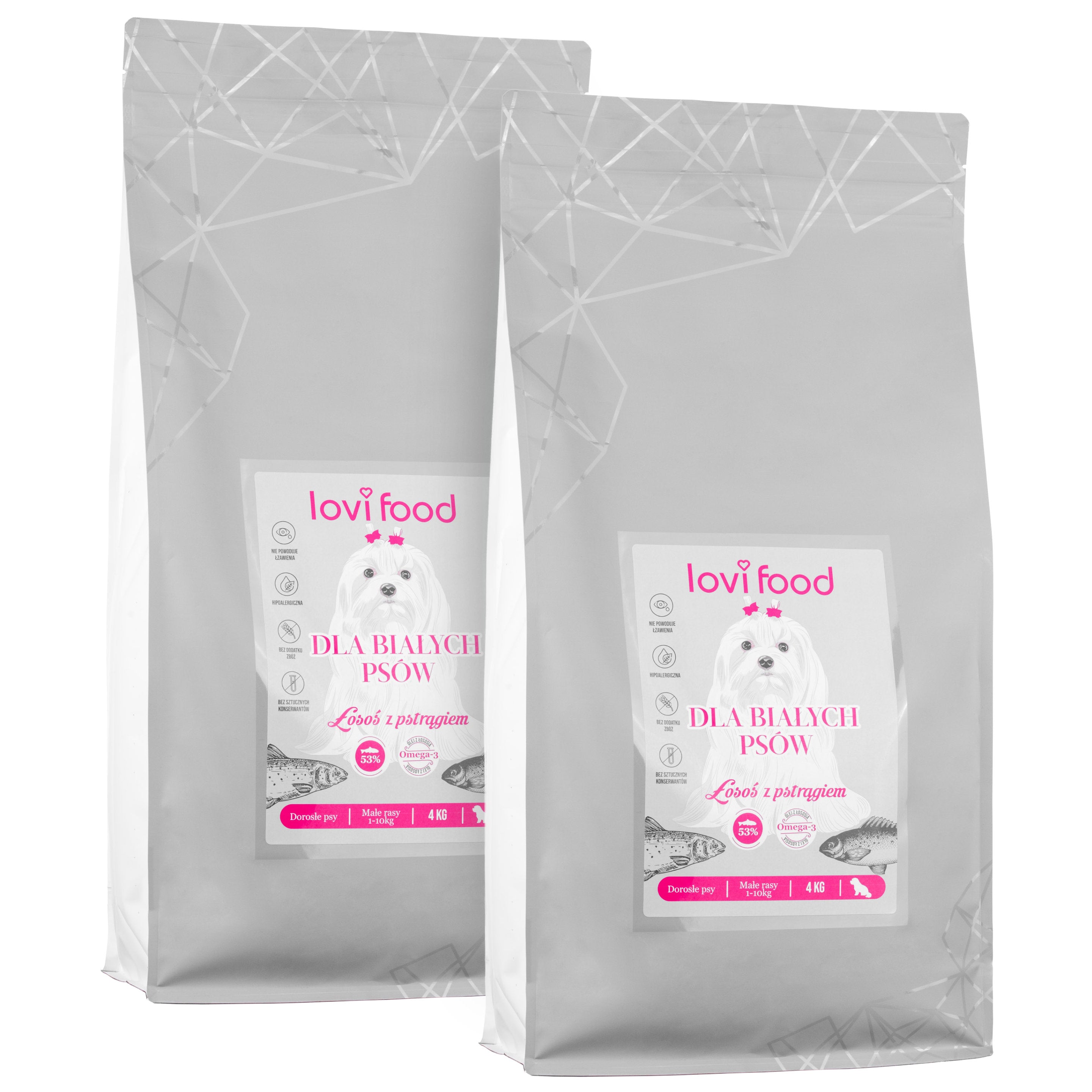 Lovi Food Salmon with Trout is a hypoallergenic, super-premium dry food designed for adult small breed dogs with white fur, made from natural ingredients to maintain a beautiful coat and overall health.