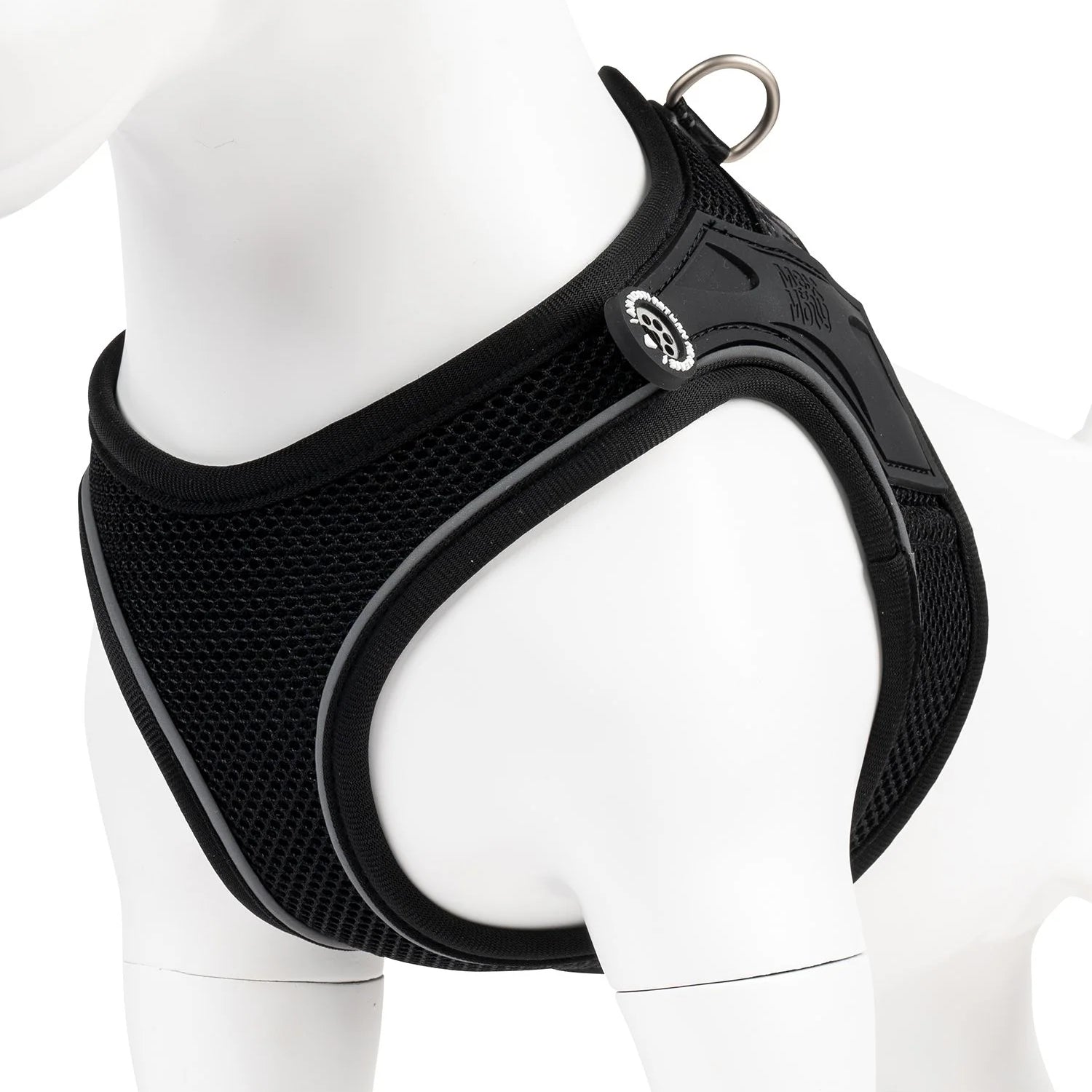 The harness is made of pleasant-to-touch, antibacterial neoprene and covered with mesh. Neoprene is an ultra-light, delicate, soft, and yet flexible material that provides the dog with a high level of comfort without compressing or rubbing the fur. The mesh ensures adequate body ventilation. Reflective piping and stitching on the straps ensure your pet is visible at night.