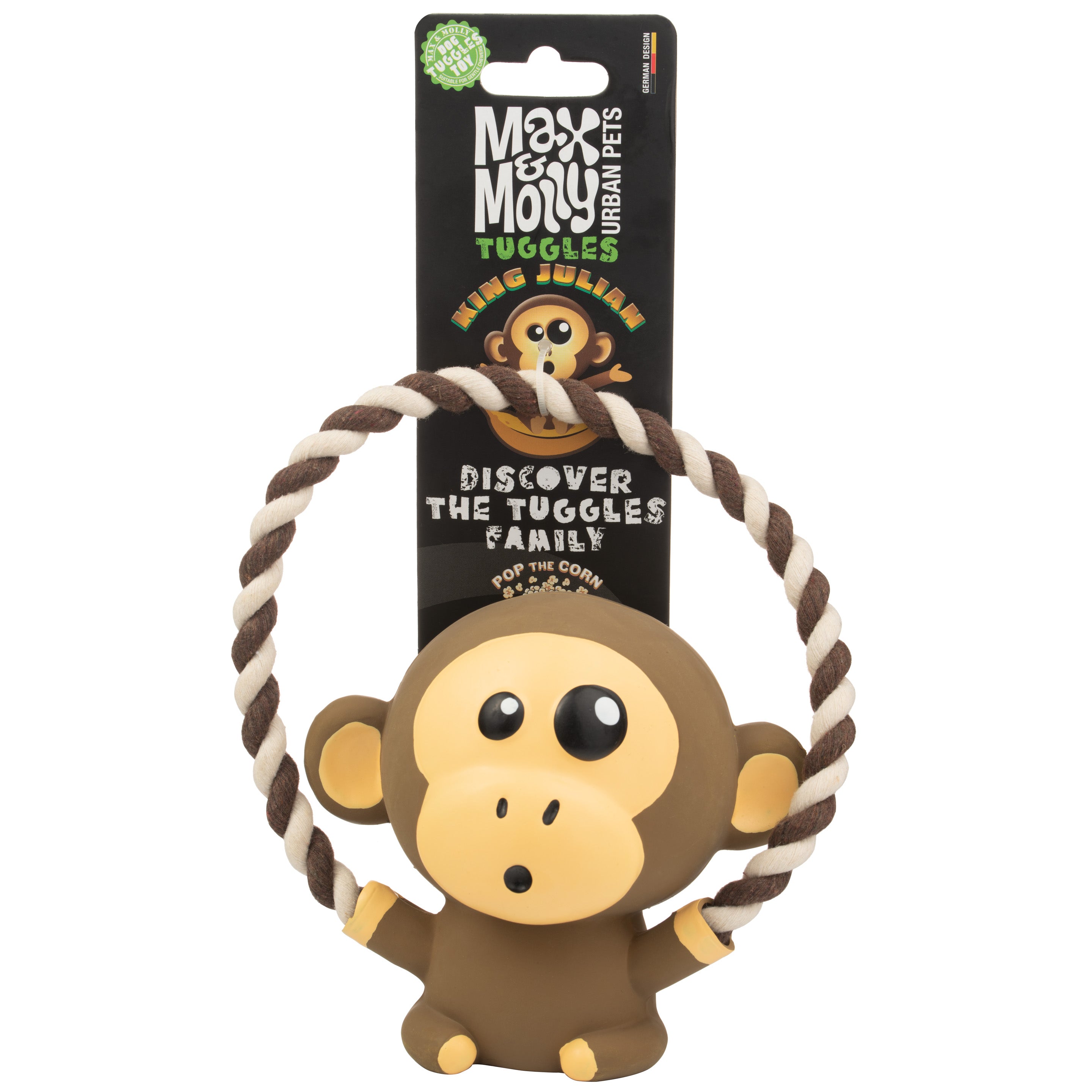 The King Julian dog toy from Max&Molly is a multifunctional and adorable latex chew toy with a rope, designed for dogs of all ages.