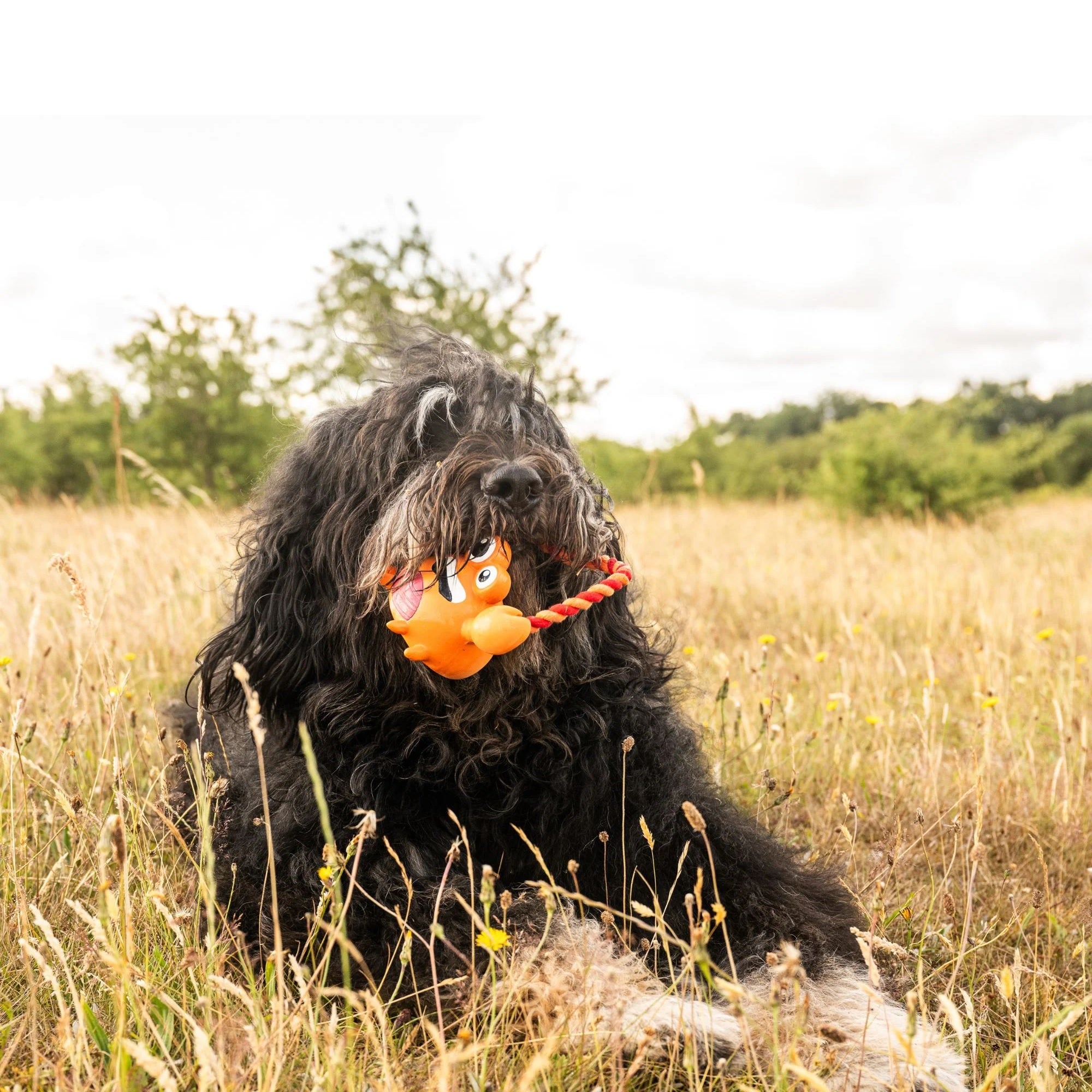 The Lenny Krabitz dog toy is a multifunctional and durable chew toy designed for dogs of all life stages, featuring a soft latex body and a cotton rope for enhanced play.