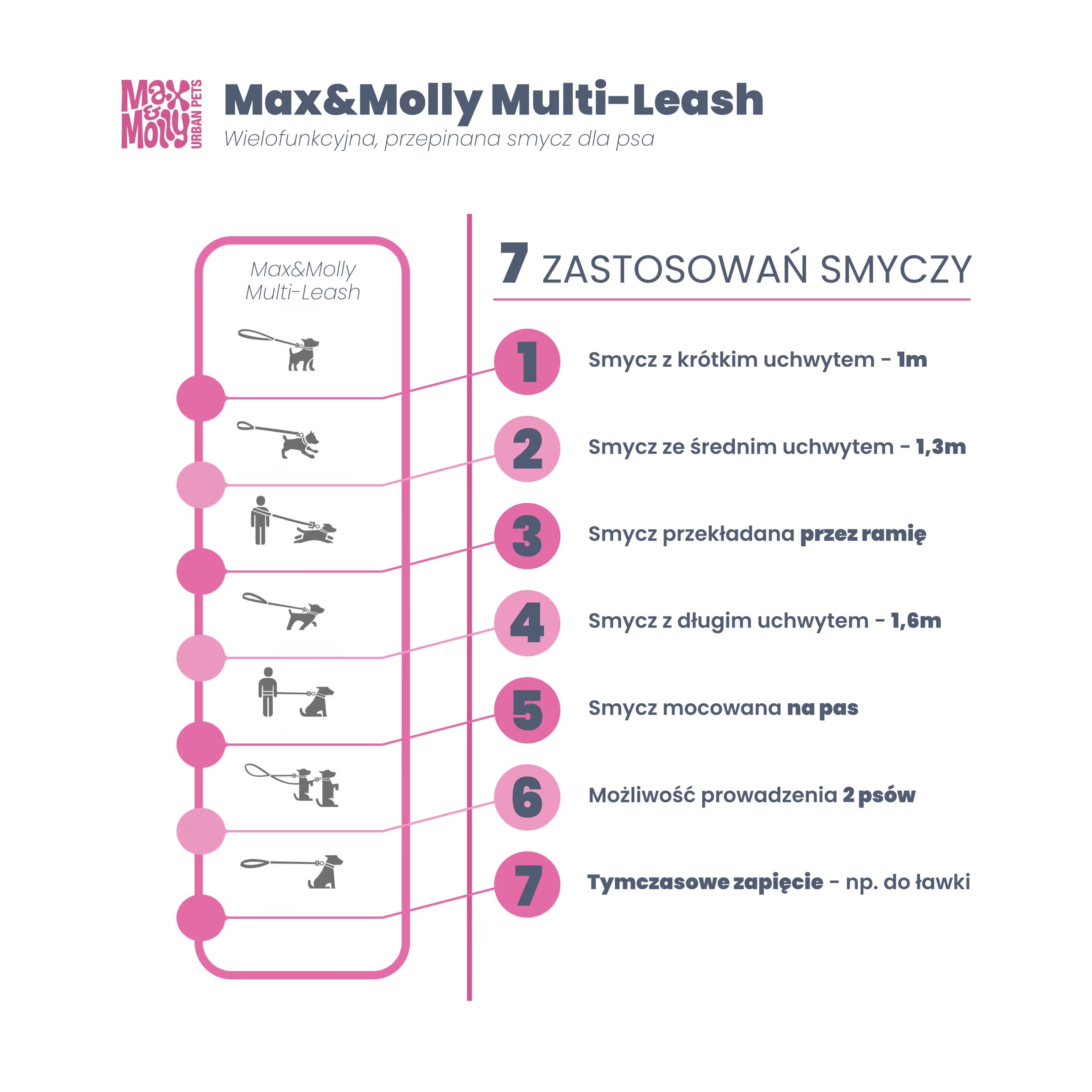 The Max&Molly Matrix 2.0 leash is very lightweight while maintaining high durability and resistance. This is all thanks to the selection of appropriate materials. It's made of thickly woven, abrasion-resistant polyester webbing lined with soft, pleasant-to-touch neoprene. You don't have to worry about keeping the leash clean, as it's machine washable at 30°C and dries very quickly. Additionally, it features a comfortable handle that won't dig into your hand and cause discomfort.