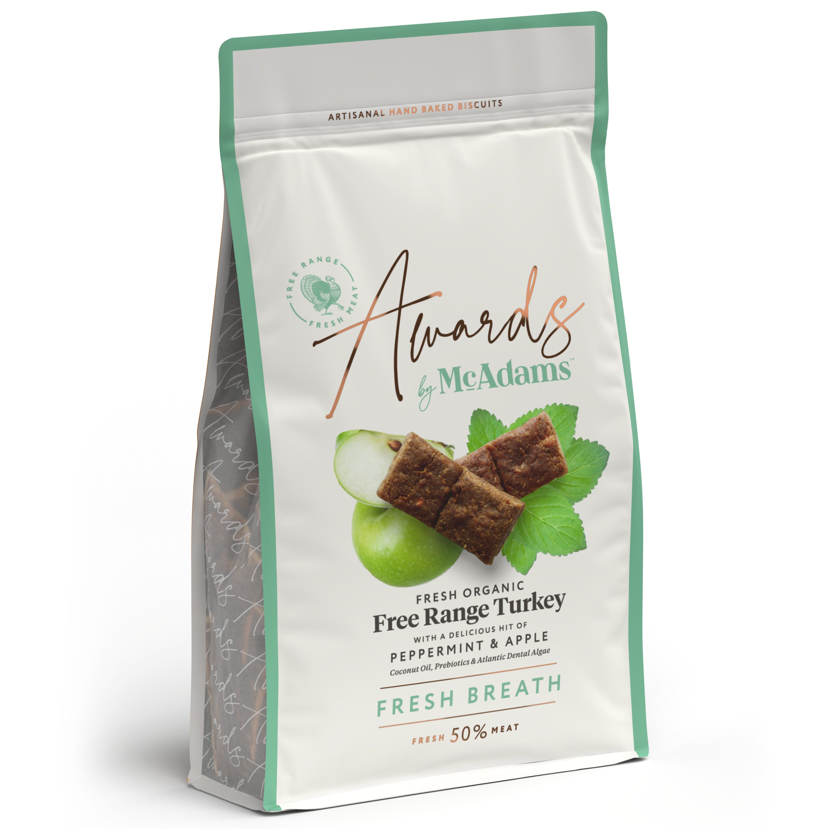 McAdams Awards Fresh Breath are artisanal dog treats made from high-quality ingredients, including organic turkey and mint, to freshen your pet's breath.