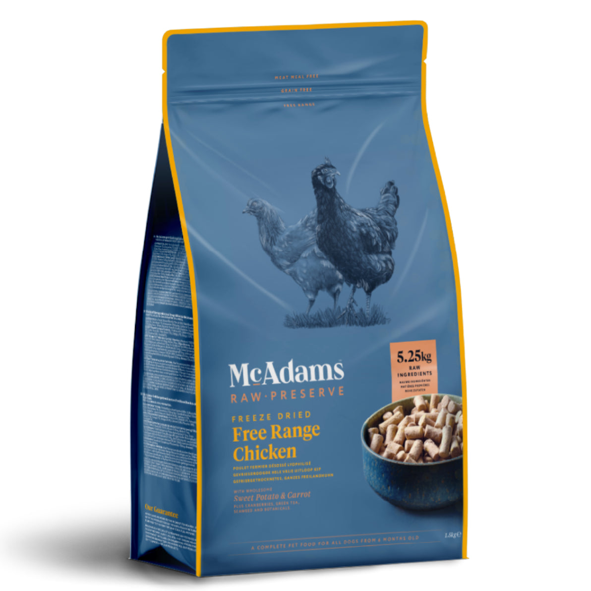 McAdams Freeze Dried Free Range Chicken is a complete, freeze-dried food for puppies and adult dogs, offering a nutritious raw diet without home preparation.