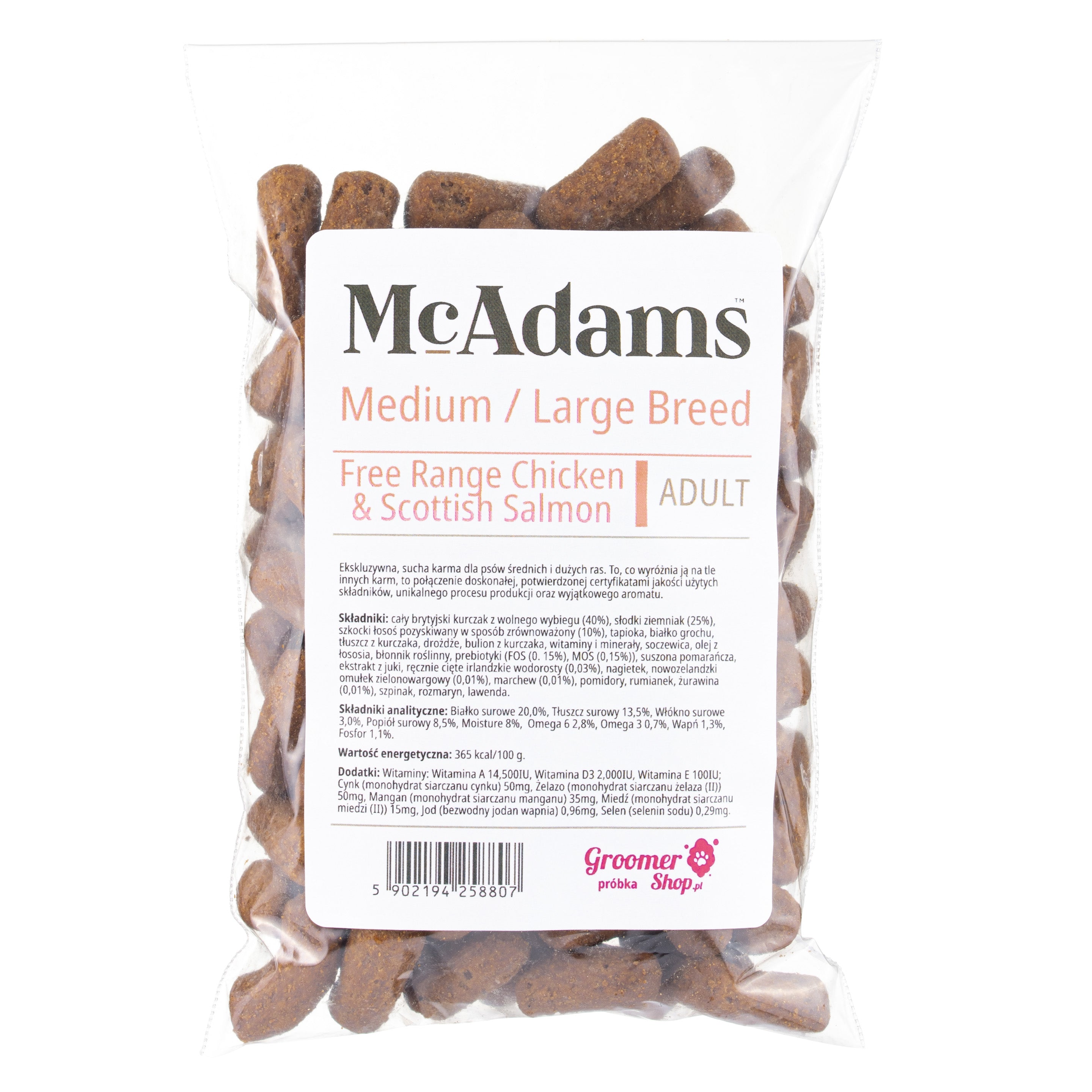 Not sure if your dog will like McAdams food? Buying a sample will allow them to see for themselves how unique and delicious these crunchy kibbles are. McAdams Medium & Large Breed Free Range Chicken & Scottish Salmon is an exclusive dry food for medium and large breed dogs. What sets it apart from other foods is the combination of excellent, certified quality ingredients, a unique production process, and an exceptional aroma. The food's size has been adapted to the size of larger dogs. It contains no grains, meat meal, MSM, colorings, preservatives, artificial fillers, or flavor enhancers. This ultra-nutritious, complete meal provides your pet with all the nutrients they need for proper functioning and a beautiful appearance. It is also highly digestible, easily digestible, and gentle on sensitive stomachs. Ideal for dogs with digestive issues, allergies, and picky eaters. This is a super healthy, well-balanced food that's a great alternative to a raw diet.