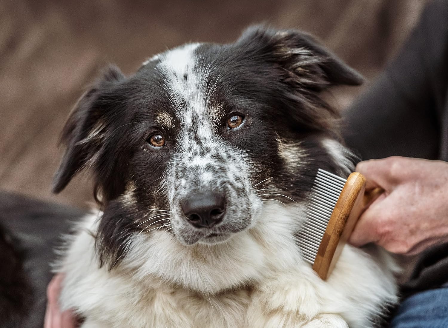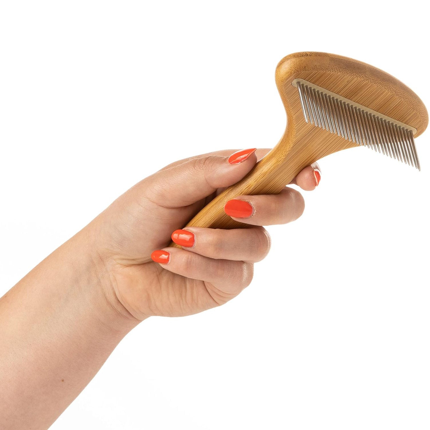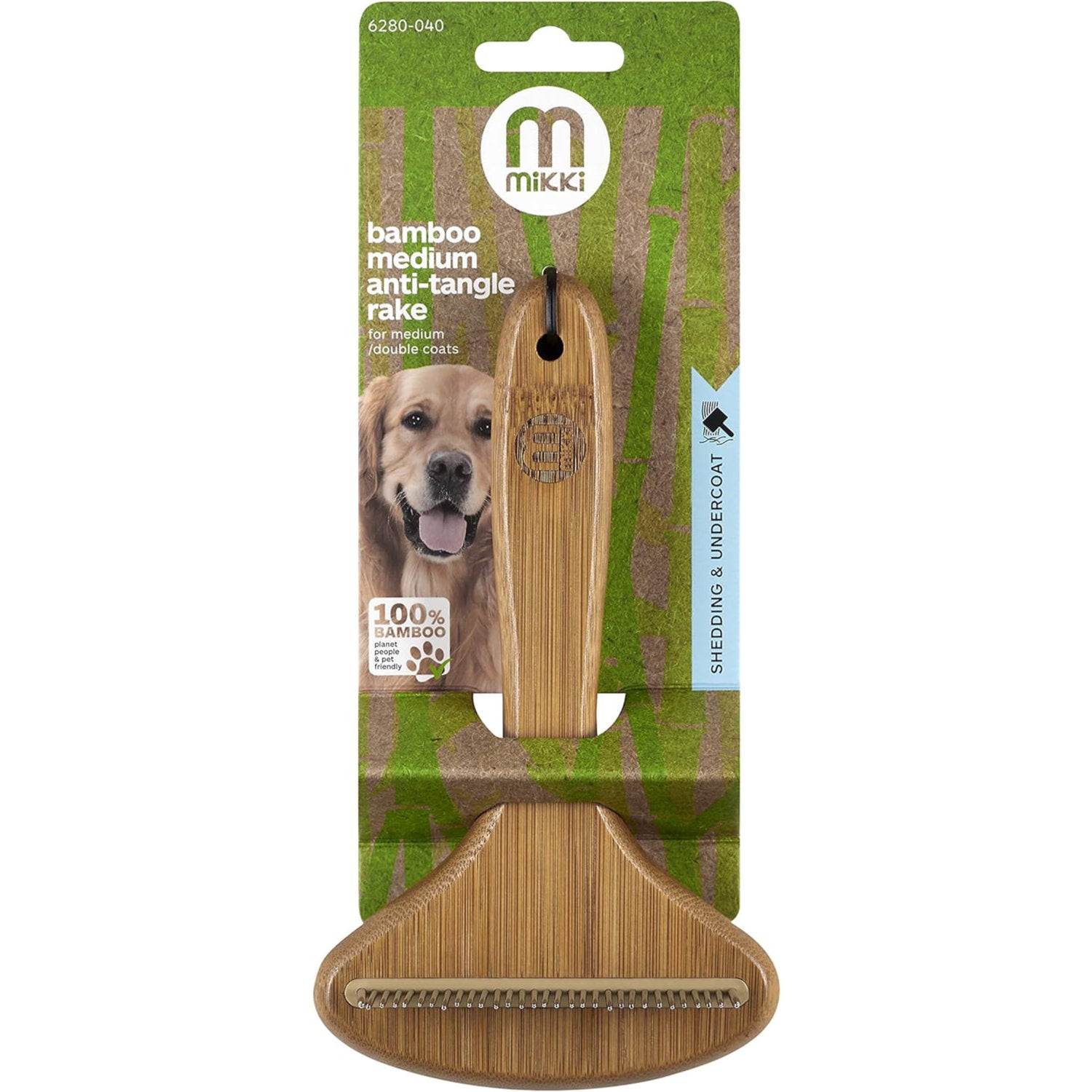 The Mikki Bamboo Medium Anti-Tangle Rake is an eco-friendly grooming tool designed for dogs with thick, medium-length fur and double coats, effectively removing dead hair and undercoat.