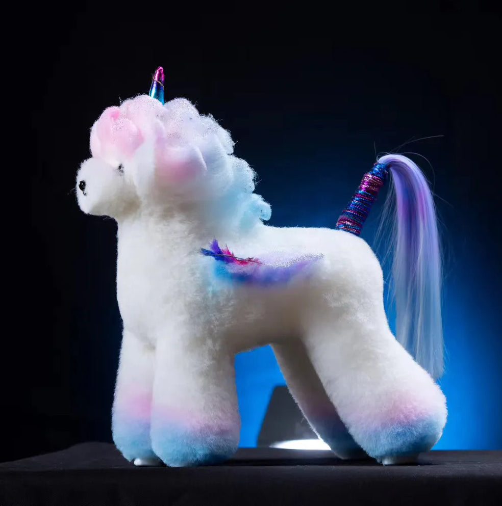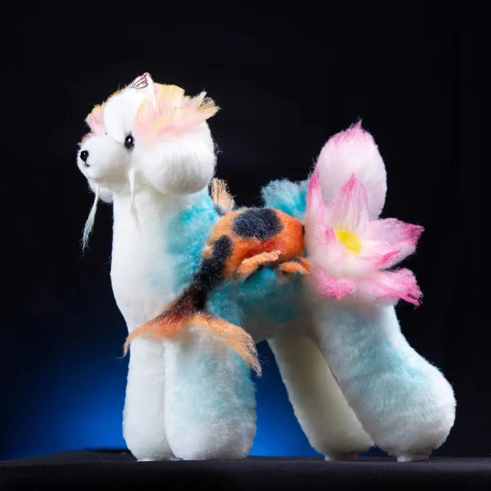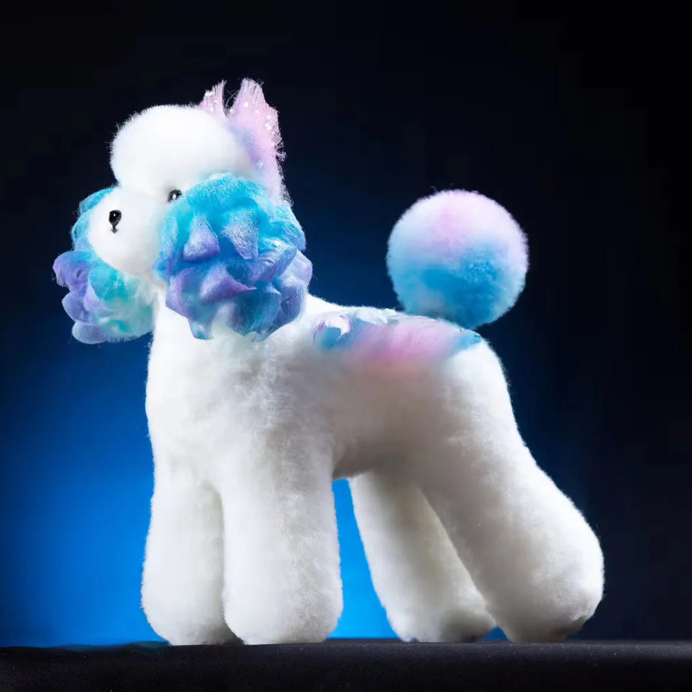 Mr. Jiang's coat is designed to protect the scissor blade while mimicking a dog's natural hair. Made of high-quality Hi-pile material, it has a hair length of 11-12.5 cm. You can style it however you like, for example, to create a teddy bear look, and dye it with blowers or an airbrush. You can also use decorative elements to complement your creation, such as bows, clips, ribbons, etc.