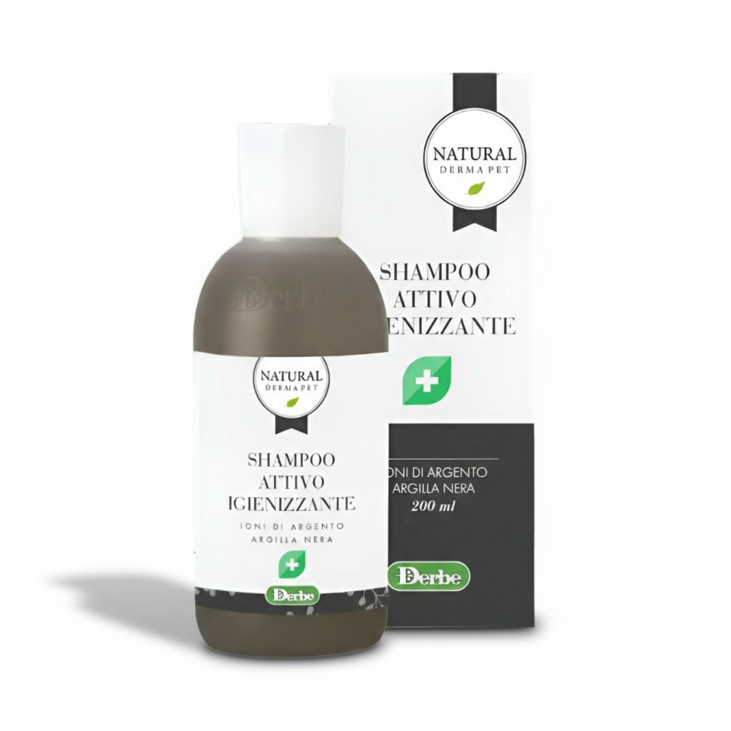 Sanitizing Active Shampoo by Natural Derma Pet is a specialized dermatological cleanser formulated to support healthy skin flora and relieve discomfort associated with irritation, redness, or seborrheic imbalance. Its advanced technology harnesses the antimicrobial and soothing properties of Active Silver Ions and the purifying strength of Black Clay. High-porosity metallic silver gradually releases ions that help control unwanted microorganisms and support an optimal microbial ecosystem on the skin’s surface, reducing the risk of opportunistic infections. The silver ions also provide a soothing effect, alleviating sensations of itching and burning.