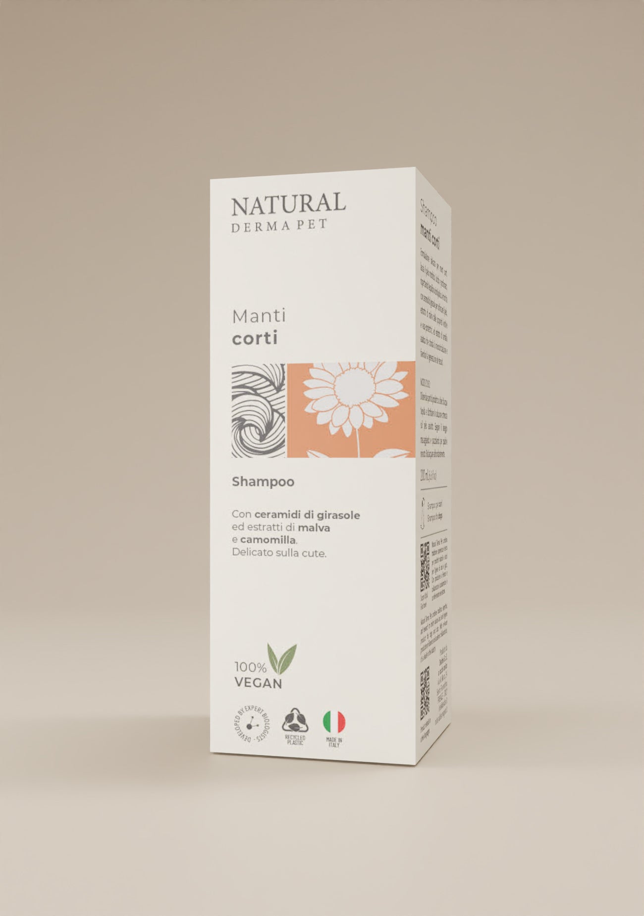 Short Hair Dog Shampoo by Natural Derma Pet is designed for breeds with short or close-fitting coats that require deep yet gentle cleansing without compromising skin health. Its formula combines Sunflower Ceramides, Mallow Extract, and Centella Asiatica Extract to deliver comprehensive nourishment and protection. Sunflower ceramides strengthen the hair structure, increase resistance to external stress, and enhance natural shine, forming a light protective barrier that prevents dehydration. Mallow extract provides soothing, astringent, and vasoprotective properties, ideal for calming sensitive or irritated skin. Centella Asiatica boosts microcirculation, supports tissue repair, and promotes skin regeneration, contributing to a healthier coat base. The balanced botanical composition ensures a thorough cleanse while maintaining the integrity of the coat’s lipid layer, making it suitable for regular professional use. The result is a clean, luminous coat with a soft, smooth finish and a pleasant, natural fragrance.