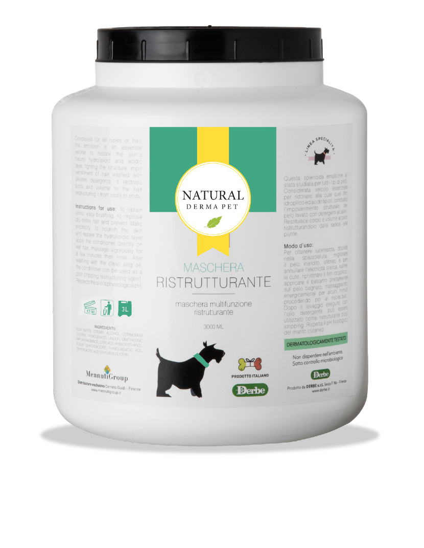 Restructuring Dog Conditioner Mask is a professional emulsion suitable for all coat types, designed to rejuvenate and restore the natural balance of the skin and coat. It acts by rebuilding the hydrophilic and acidic film of the skin, which can be depleted by frequent washing or harsh alkaline shampoos. The formula combines argan oil for brilliance and elasticity, shea butter for nourishment and conditioning, and thymol for its dermo-purifying and stimulating action on the hair bulb. Together, these ingredients reinforce the coat’s structure from root to tip, restoring softness, shine, and volume. Ideal for dry, damaged, or long coats, it smooths knots, reduces static electricity, and facilitates brushing, leaving the fur light, healthy, and radiant.