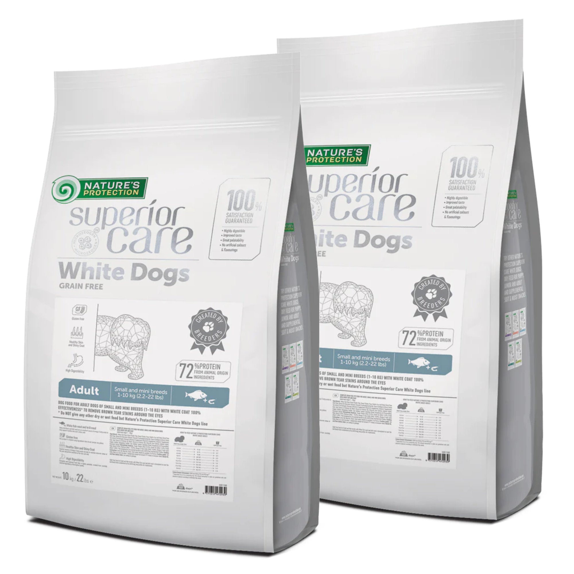 Nature’s Protection Superior Care White Dogs White Fish Small Breeds Adult is a grain-free dry food designed to maintain the white coat condition of small adult dogs.