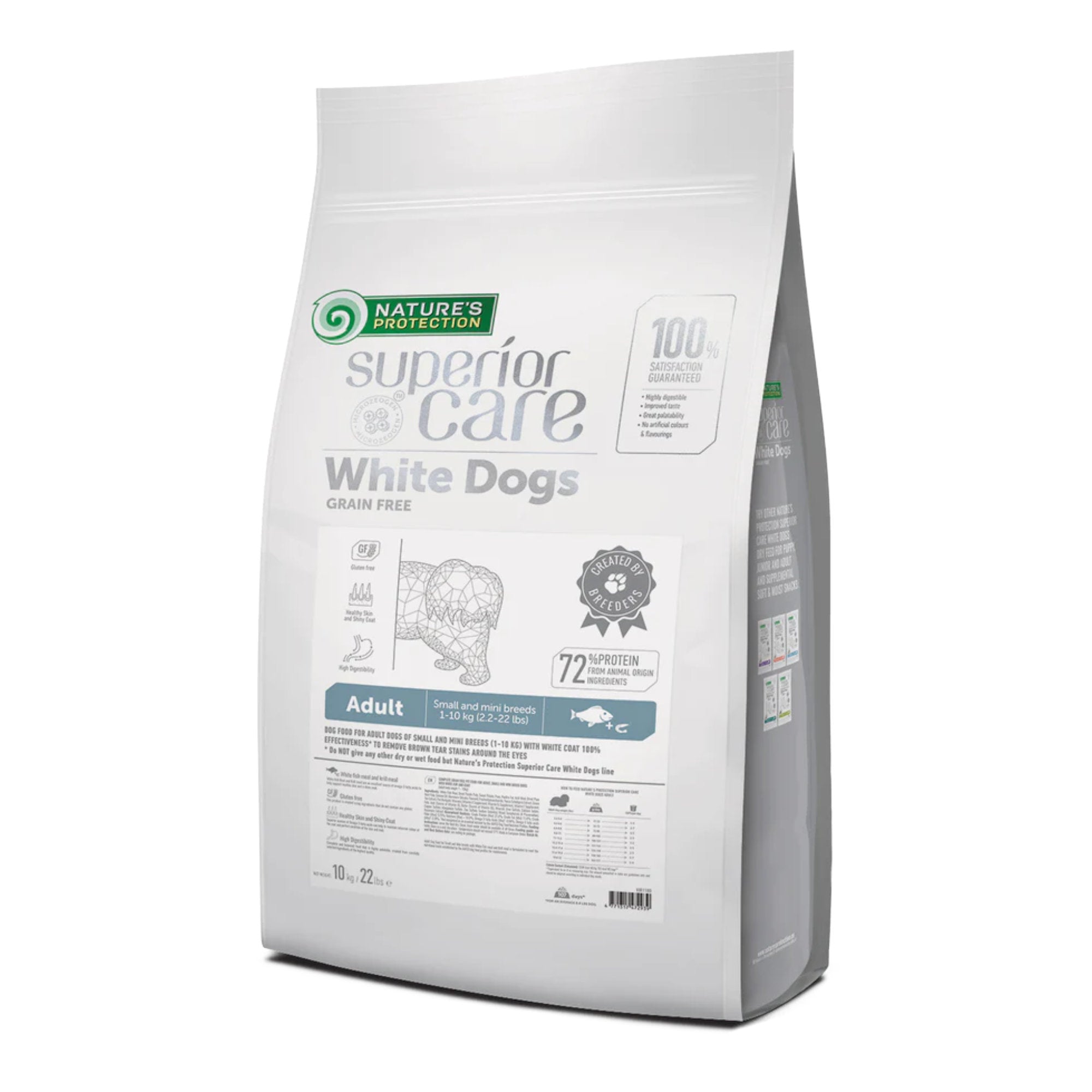 Nature’s Protection Superior Care White Dogs White Fish Small Breeds Adult is a complete, grain-free dry food for adult white dogs (from 10 months of age), small and mini breeds (adult weight from 1 to 10 kg). Superior Care White Dogs Adult meets the nutritional needs of adult dogs, maintains white coat condition, helps remove rusty tear stains (stains on the face), and strengthens the coat from the inside.