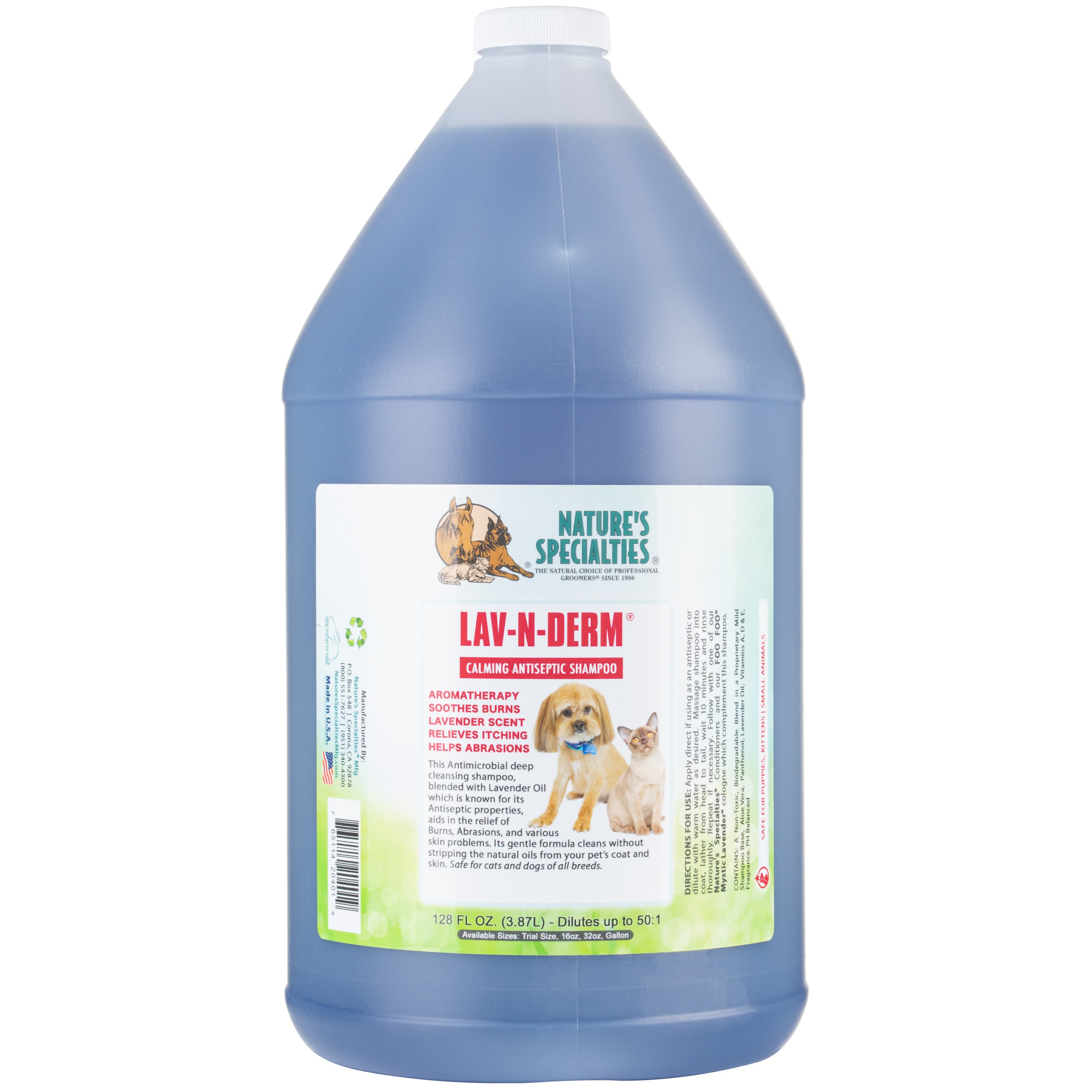 Nature's Specialties Lav-N-Derm Shampoo is an antibacterial shampoo for dogs and cats that provides relief from burns, scalds, abrasions, and various skin problems.