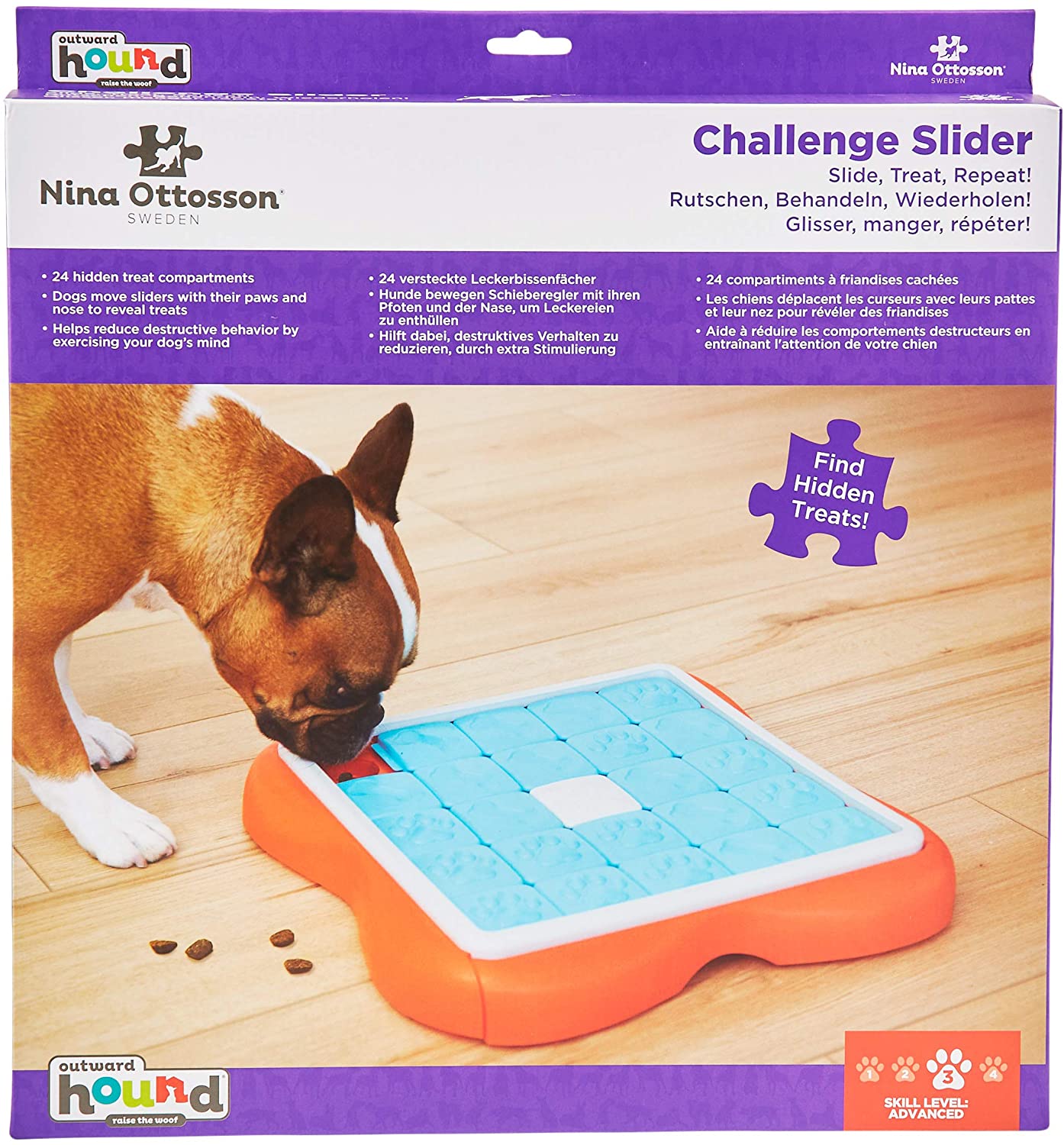 Discover the fascinating educational game for dogs - Nina Ottosson Dog Challenge Slider. The third difficulty level is designed for intermediate players working their way up to expert level. Dog Challenge Slider is a fun, exercise, and learning experience that will train your dog's mind and strengthen the bond between you through interactive play. Watch your dog become a puzzle master!
