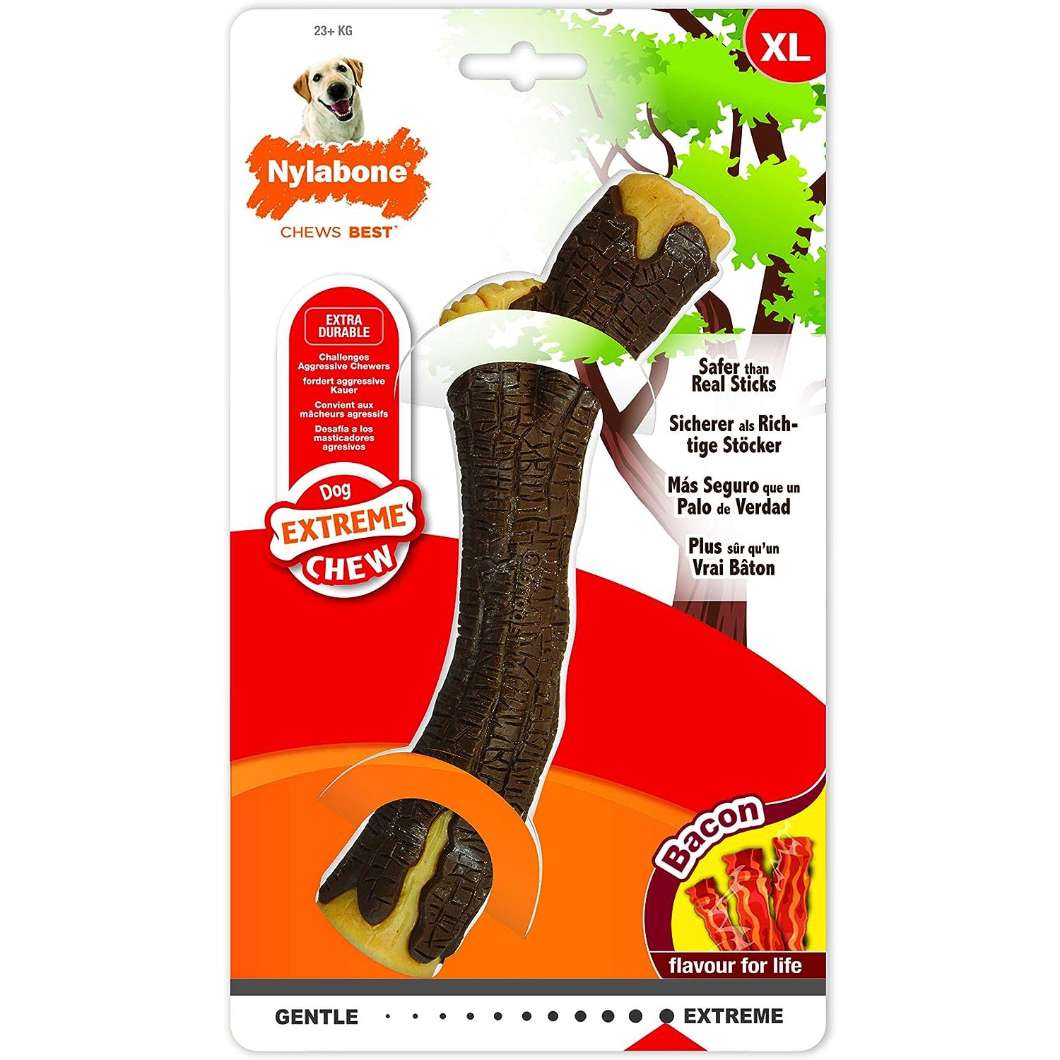 If your dog loves chewing on sticks but needs a safe and durable alternative, the Nylabone Bacon Extreme Wooden Stick Chew is the perfect choice.