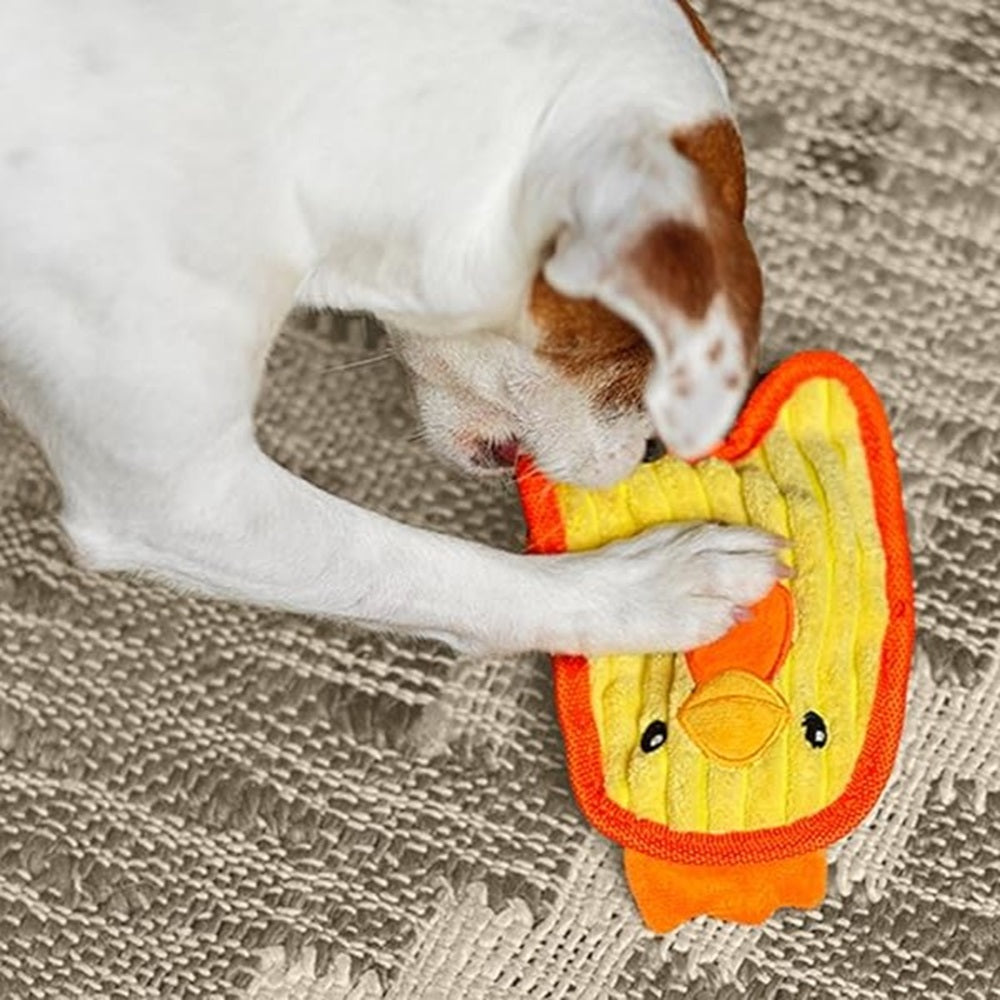The Outward Hound Durablez Chicky is a small, flat dog toy designed for dogs who prefer squeaky toys, featuring a low-pitched squeaker and durable materials.