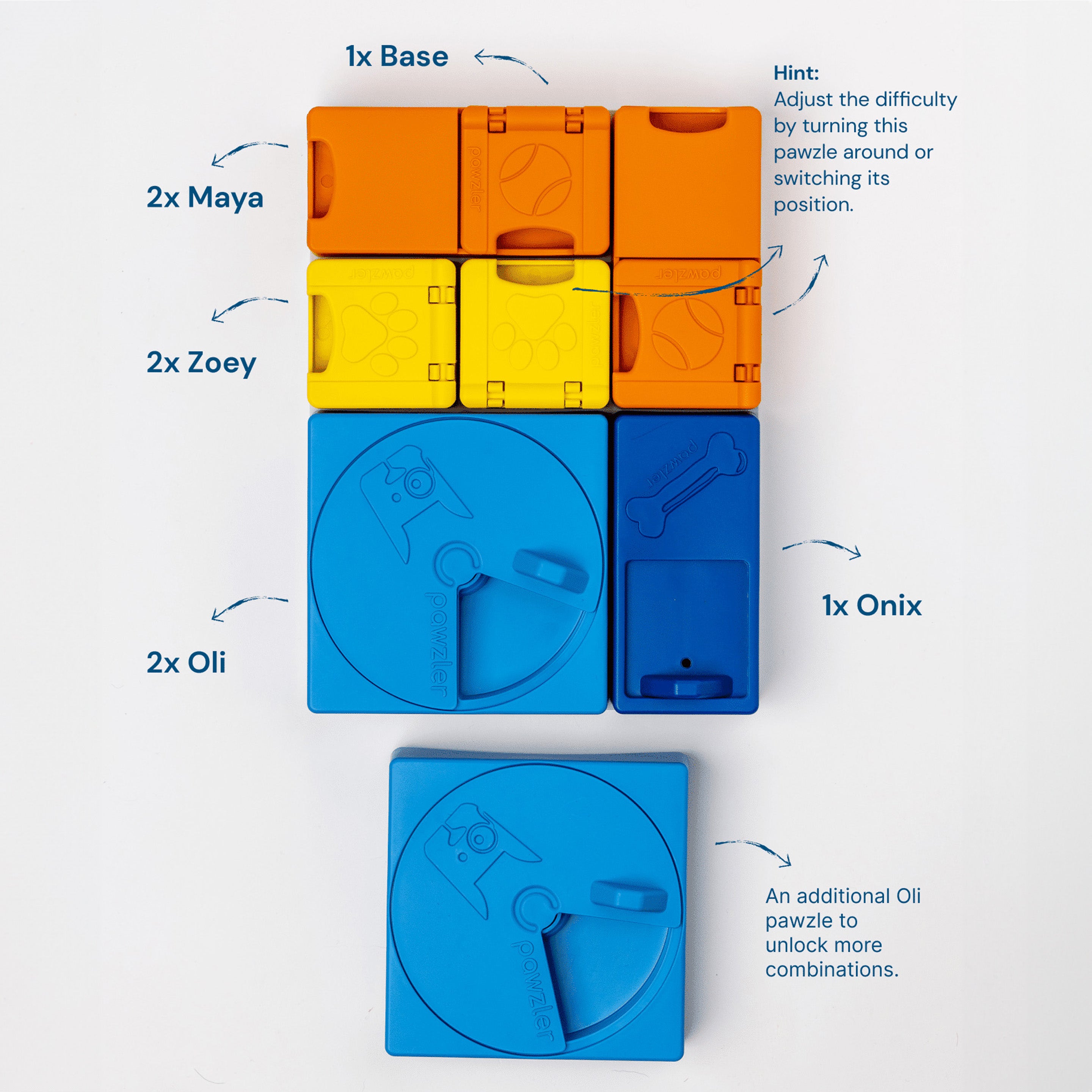 Tip: You can connect different Pawzler sets to create large puzzles. Use the large hiding places like blocks, connecting the bases.