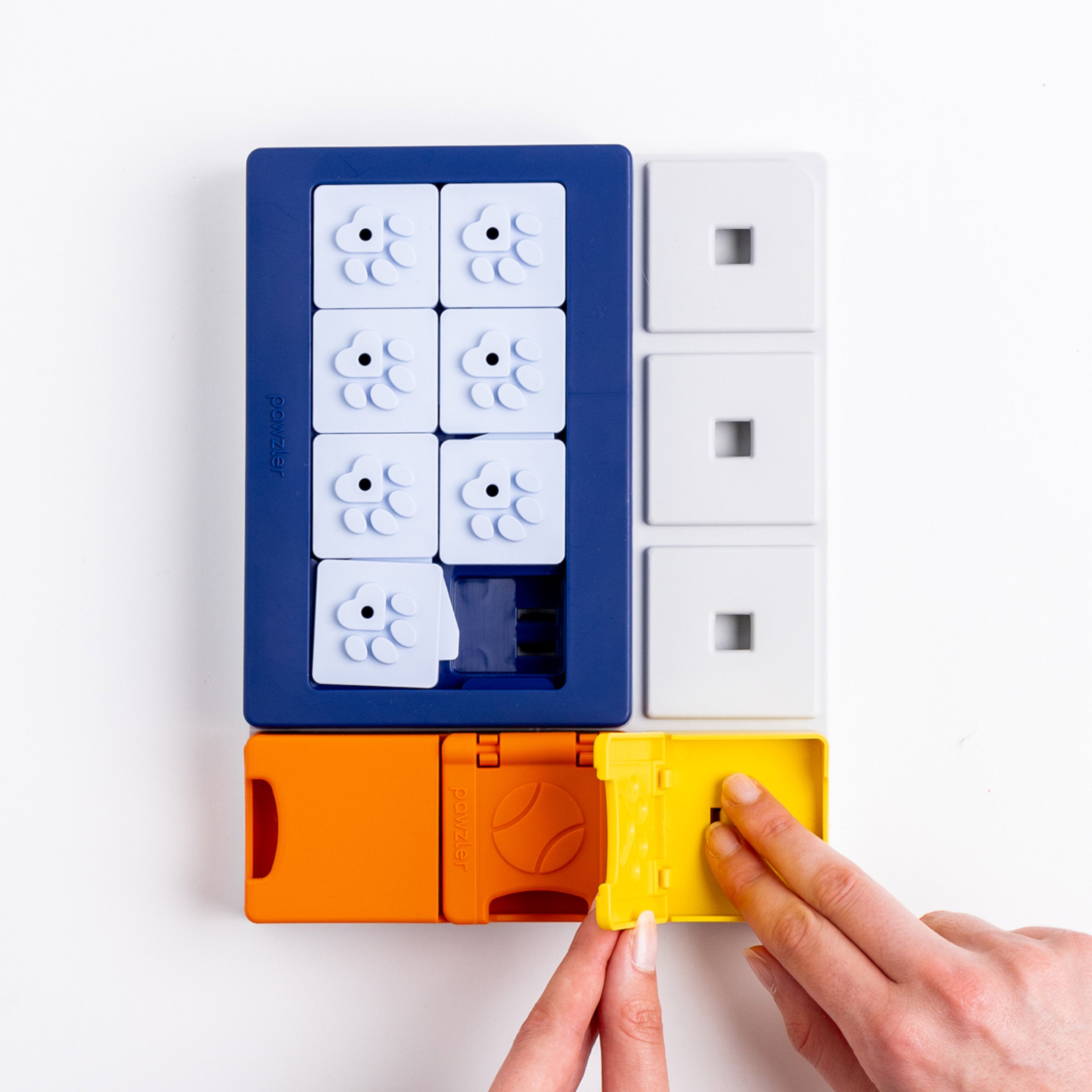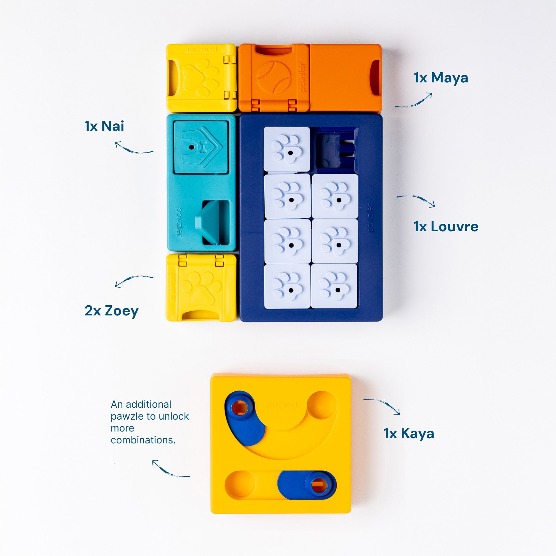 This treat toy set is designed for dogs who already have some puzzle skills. It combines elements from levels 1, 2, and 3 – something for everyone. This modular puzzle builds your pet's confidence and cognitive development while strengthening the bond between owner and pet.