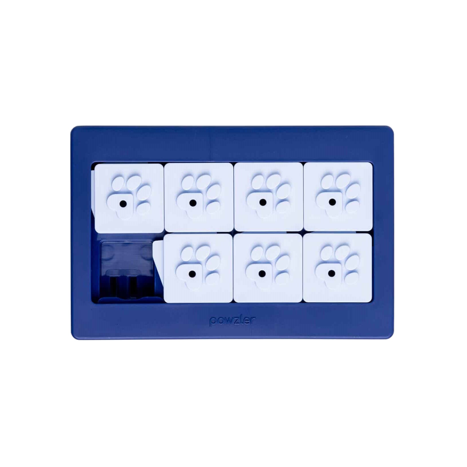 The Pawzler Louvre is a single module of the Pawzler dog puzzle. This level 3 block holds 8 hidden treat stashes. This is an additional element that you can interchange with other modules in Pawzler sets, or create your own set by purchasing a base and other blocks. The Louvre is a navy blue box with 7 blue paw-patterned sliders that require your dog to push the sliders (with their nose, tongue, or paw) in multiple directions to reveal hidden treats.