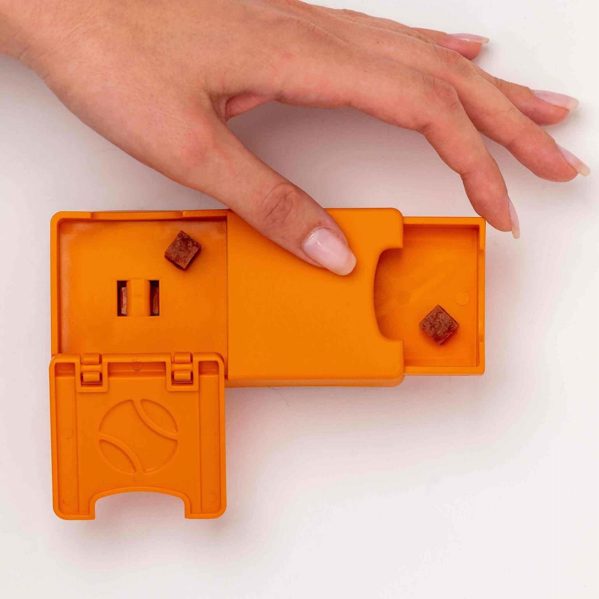- It requires your dog to master the mechanics of lifting the lid and sliding the drawer open to reveal the treats hidden beneath.