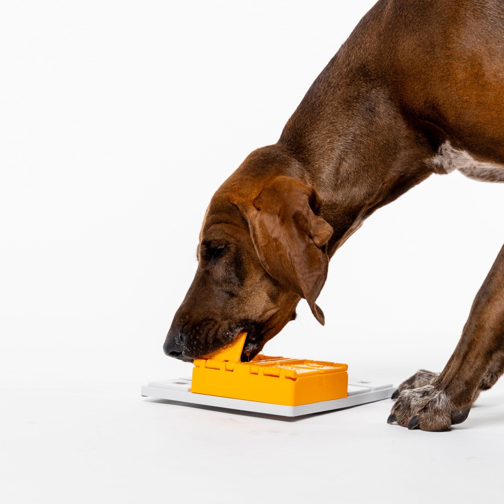 Pawzler Piper is a single module of the Pawzler dog puzzle. This level 3 block contains 4 treat stashes with 2 locks. This is an additional element that you can interchange with other modules in Pawzler sets, or create your own set by purchasing a base and other blocks. Piper is a yellow box with 4 stashes: a combination of 4 containers with a lid and 2 sliders that lock the flaps. This requires your dog to master the mechanics of sliding the locks and opening the flaps to reveal the hidden treats. Your pet can open them with their nose, tongue, or paw.