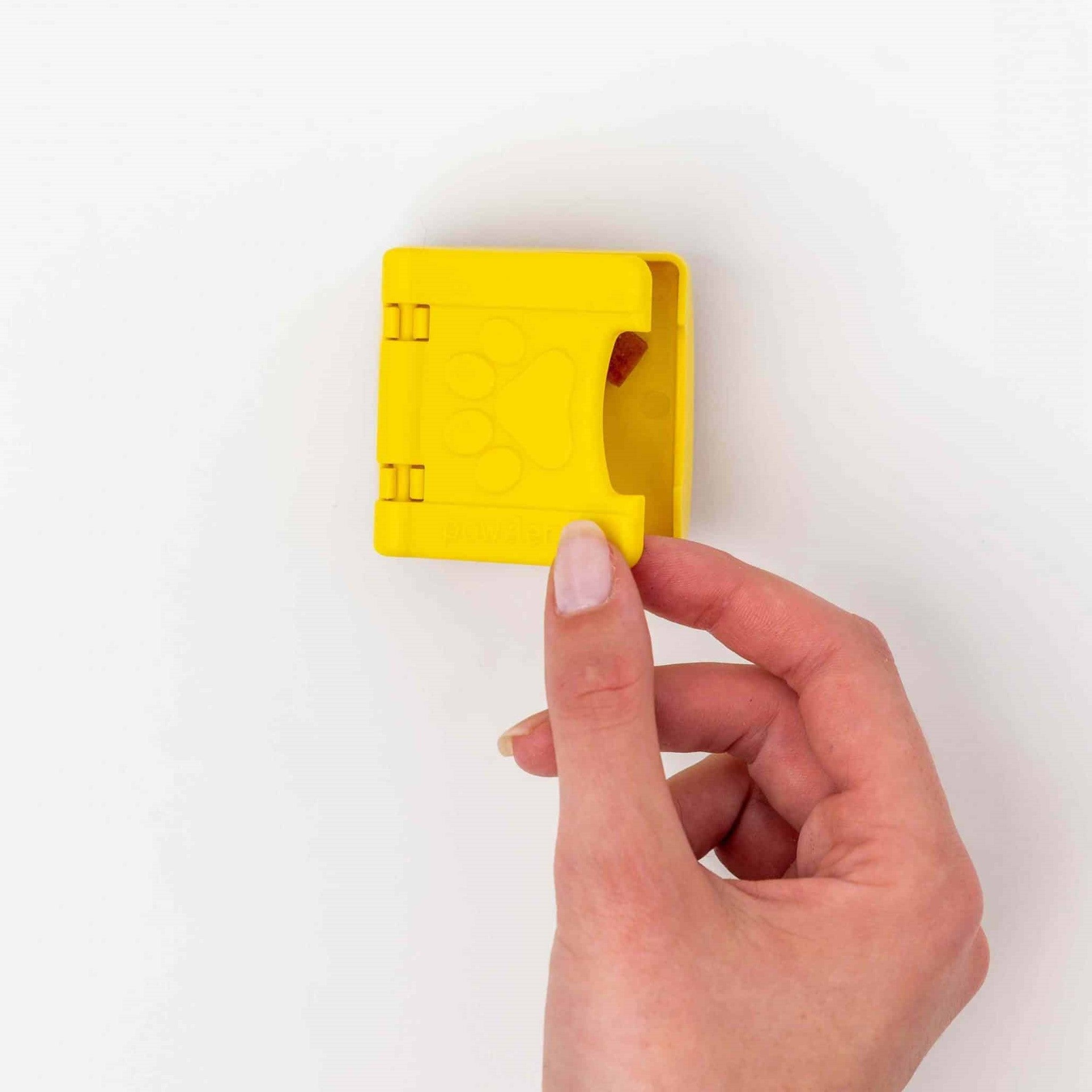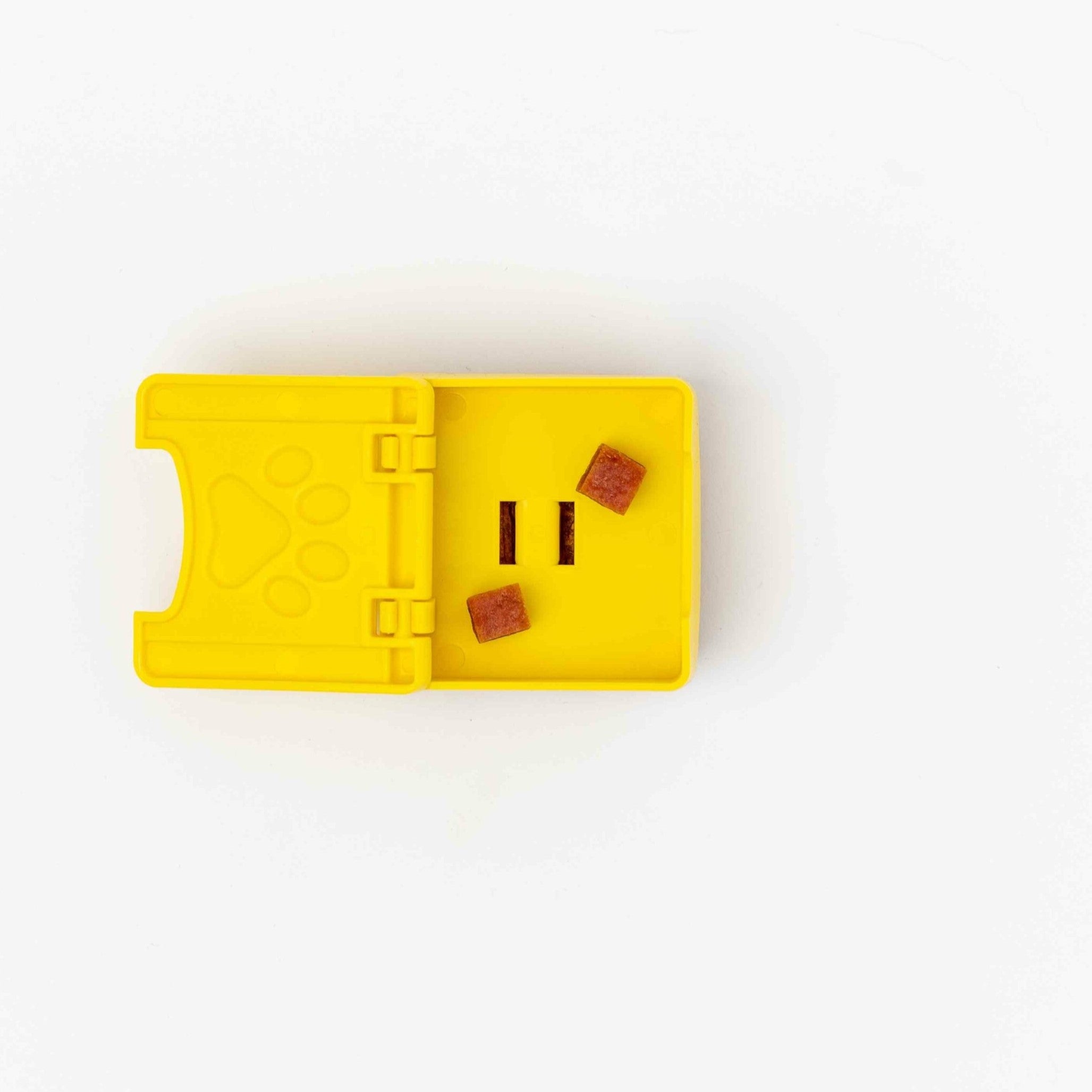 Pawzler Zoey is a single module of the Pawzler dog puzzle. This level 2 block holds one hidden treasure chest. This bonus element can be installed interchangeably with other modules in Pawzler sets, or you can create your own set by purchasing a base and other blocks. Zoey is a yellow box with a hinged lid (with a paw print) that requires your dog to lift the lid (with their nose, tongue, or paw) to reveal a hidden treat. Zoey is a module that can interact with other blocks on the base, as it blocks access to other hidden treasures when opened. This feature adds an extra level of challenge, ensuring your pet has even more fun and engaging play!