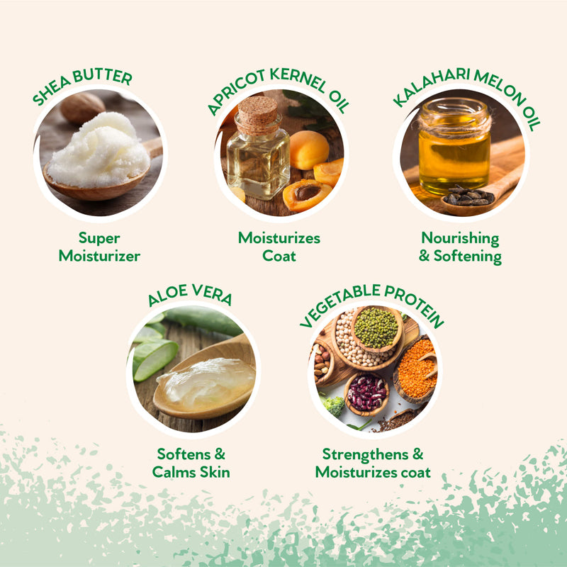 The cosmetic was created especially for dogs with long and curly hair. Its formula contains shea butter, which acts as an intense moisturizer, eliminating even the most stubborn tangles. Apricot oil and Kalahari melon oil deeply moisturize the skin and fur, leaving them soft and pleasant to the touch.