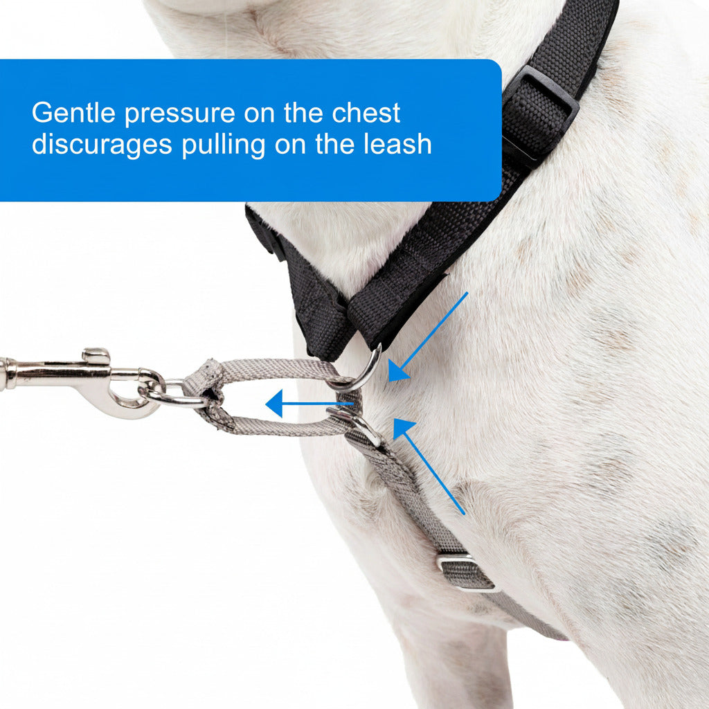 If your dog tends to pull hard on the leash, this harness will help you teach them better manners during walks. The Martingale attachment on the chest gives the owner greater control over their pet – when the dog pulls intensely, a small section of the front strap tightens, exerting gradual pressure on the animal's shoulders. Don't worry about the strap pressing against your pet's neck, as you would with a standard collar. No-pull harnesses don't cause a choking hazard. When the leash is attached to the front of the harness, you can gently guide your dog, letting them know which direction to go.