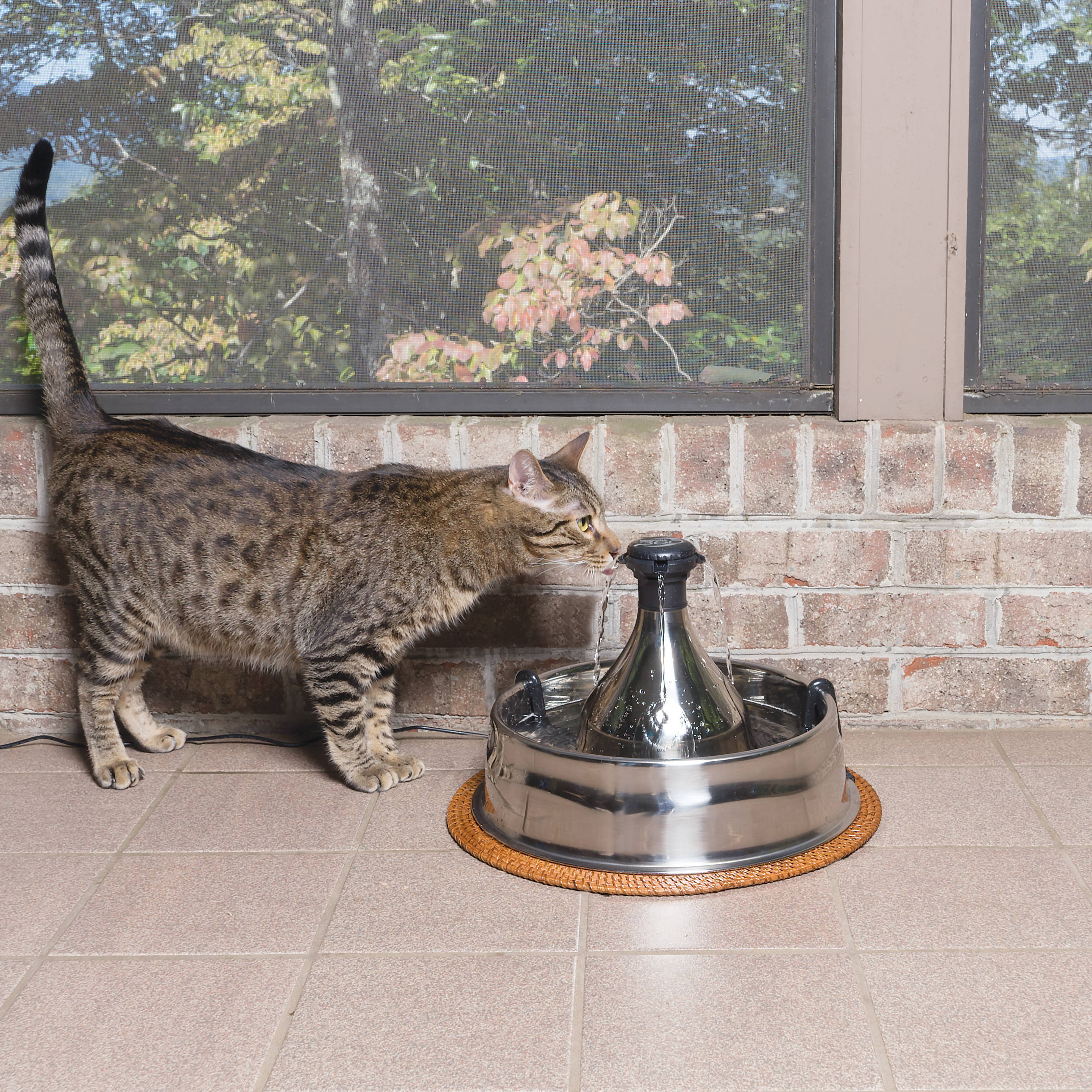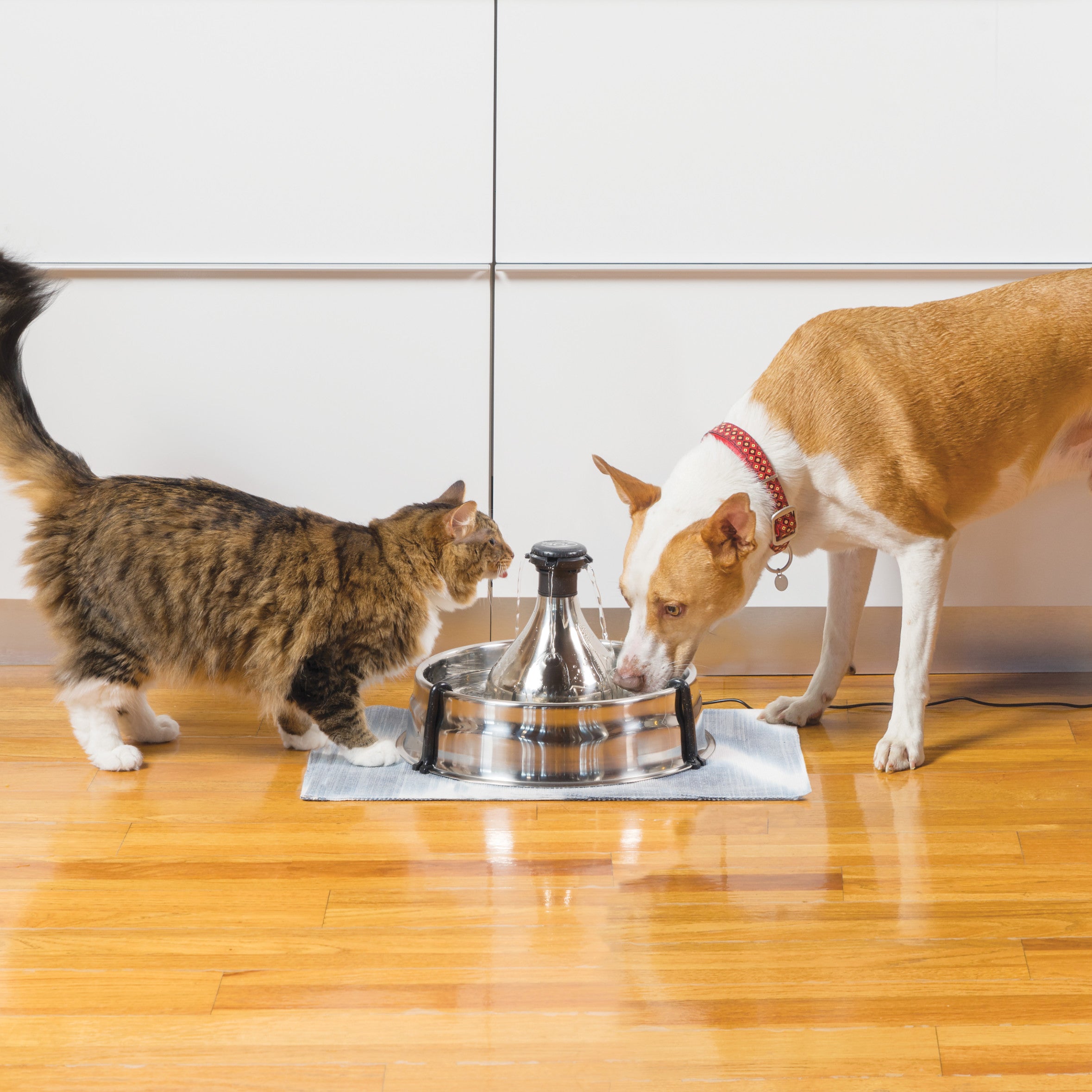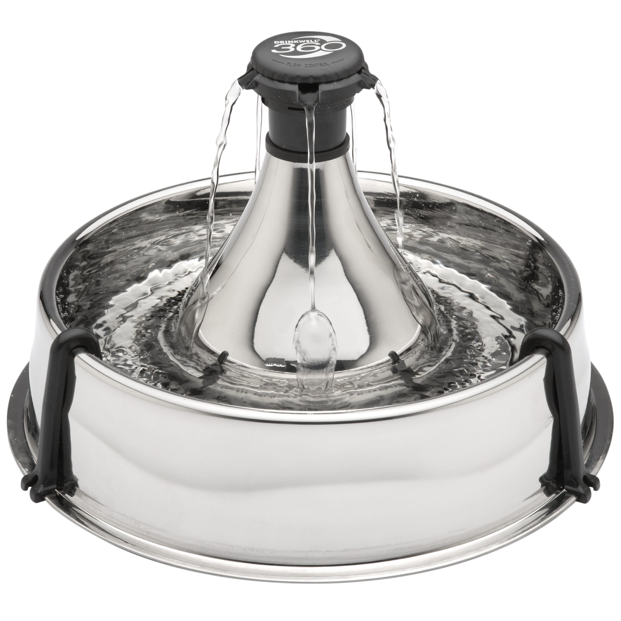 The PetSafe Drinkwell 360 Stainless Steel Pet Fountain is a fountain for cats and dogs that will help you keep your pet hydrated. It provides your pet with access to fresh, filtered water 24/7. The free-falling stream of fresh water encourages cats and dogs to drink more, which helps prevent urinary tract infections and kidney disease. Constant circulation adds more oxygen to the water and inhibits bacterial growth.
