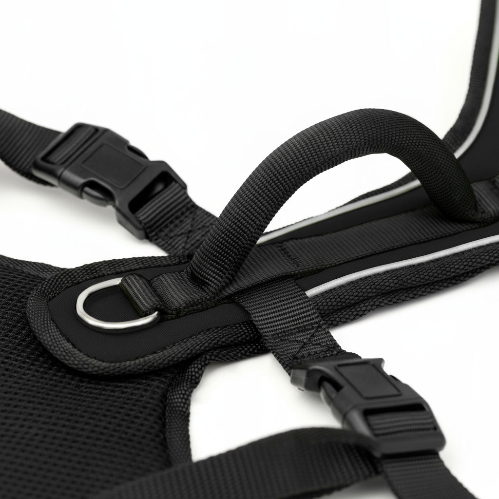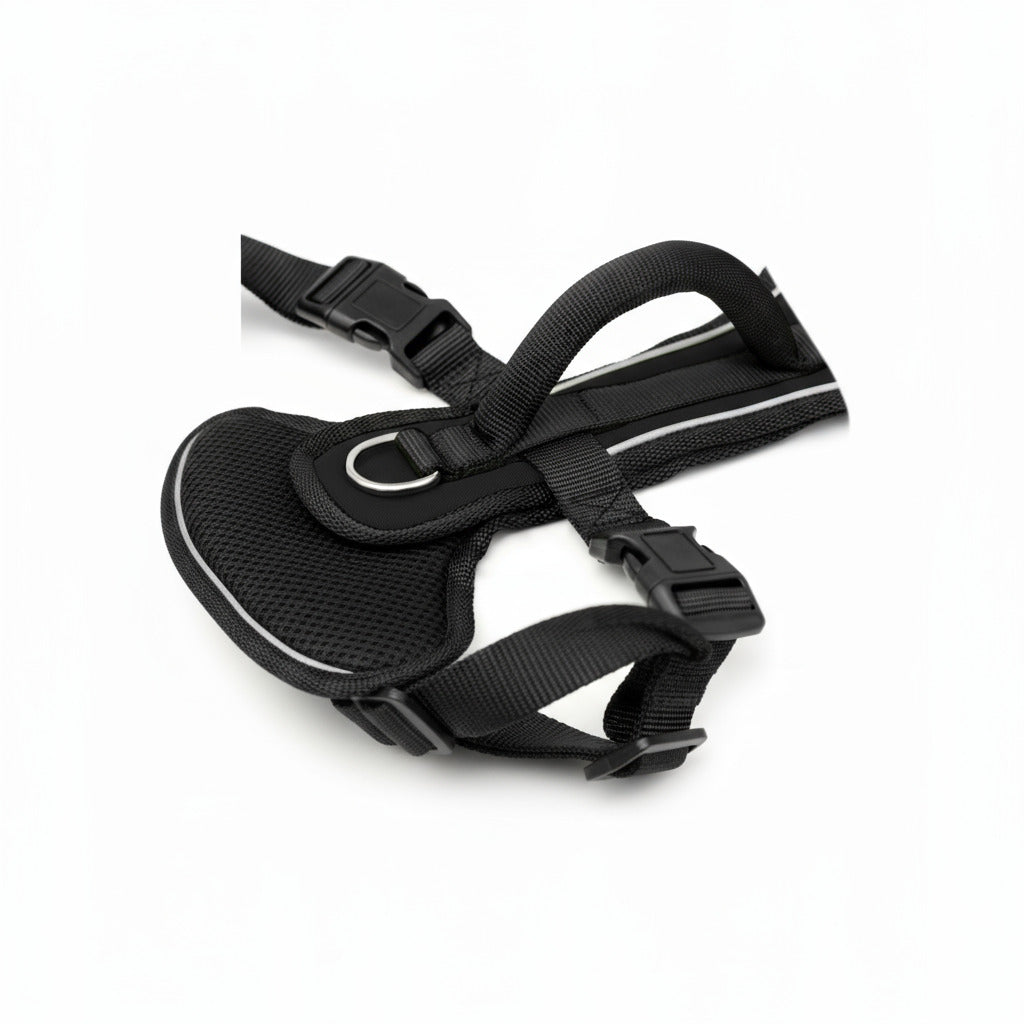 The inside of the harness is lined with breathable mesh, which promotes proper ventilation for your dog, especially important during sports. The elastic neckline makes it easy to put on and take off the harness, while also providing freedom of movement by gently flexing as you move your neck. The back strap is adjustable and fastens with two snap buckles, allowing you to easily adjust the harness to your dog's body shape, and putting it on takes only a moment.