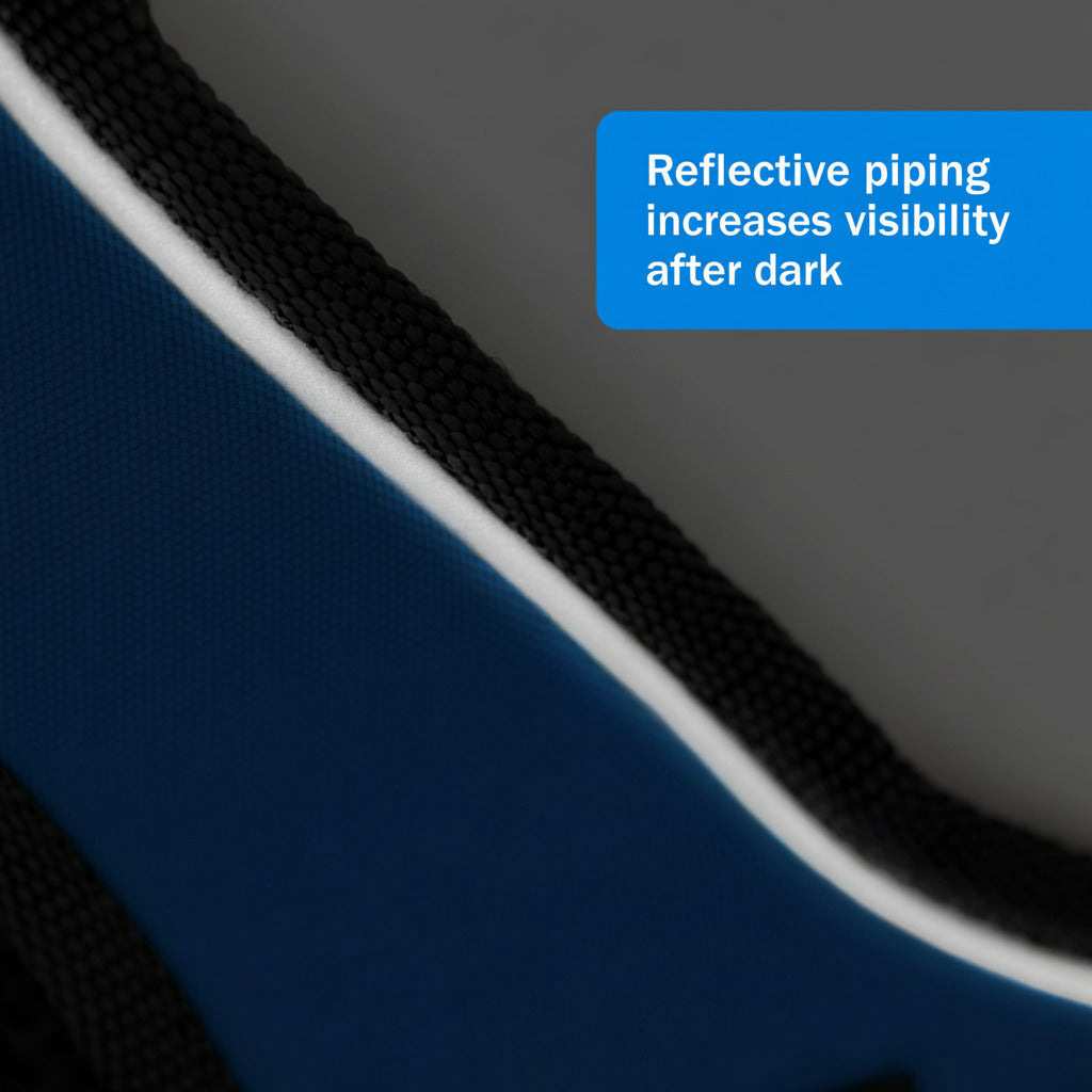 A convenient handle on the back allows you to quickly take control of your pet when the situation calls for it. The PetSafe Easy Sport dog harness is made of nylon, which is characterized by low water and dirt absorption, copes well with harsh weather conditions, and is easy to clean. Strong snap buckles and a sturdy metal D-ring prevent your dog from escaping the harness or breaking off the leash, even during vigorous play. Reflective piping increases visibility and safety after dark.