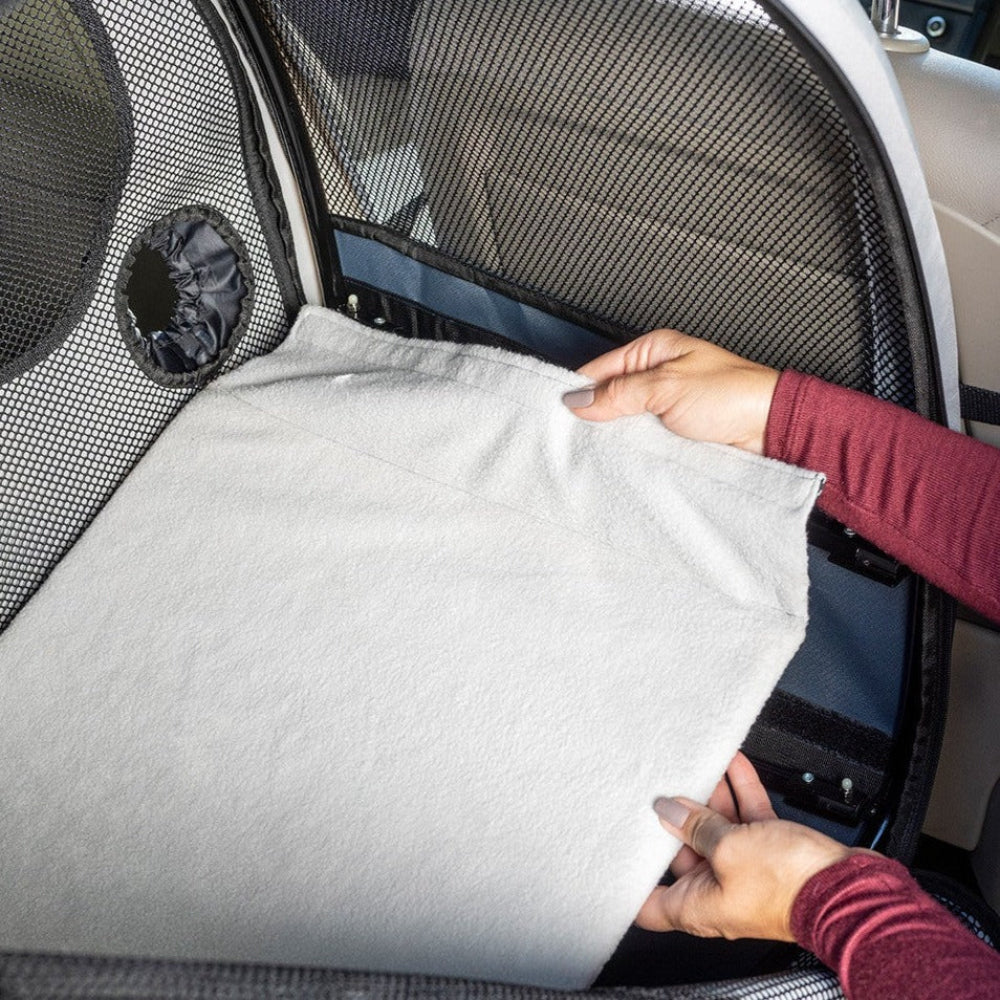 Inside the carrier, there's a comfortable cushion with a removable, machine-washable fleece cover. The cushion is attached to the carrier floor with Velcro, preventing it from shifting when your pet changes positions. The outer shell of the foldable carrier can also be removed and thrown in the washing machine.