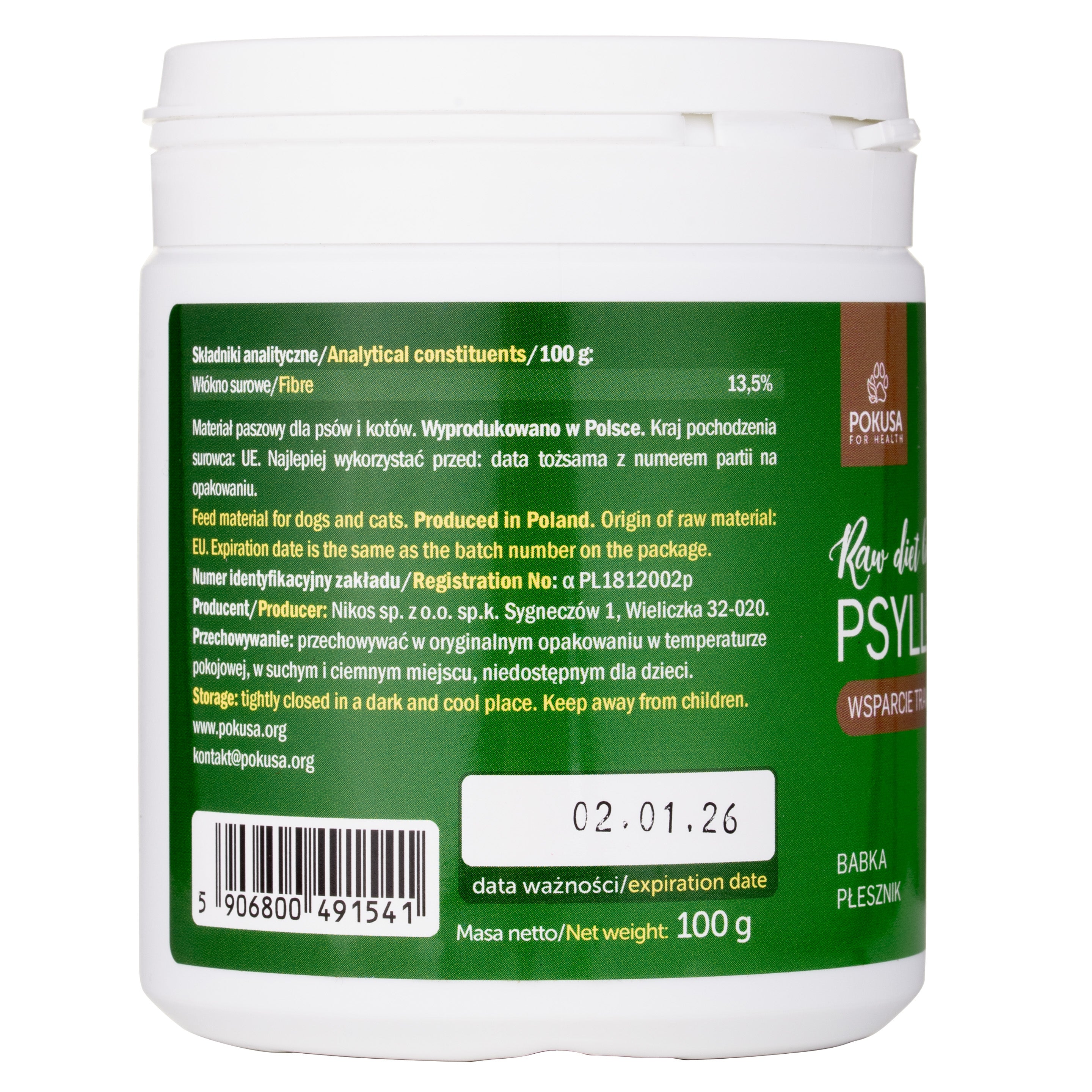 Pokusa Raw Diet Line Psyllium is a natural source of fiber for dogs and cats, supporting digestive health and preventing issues like diarrhea and constipation.