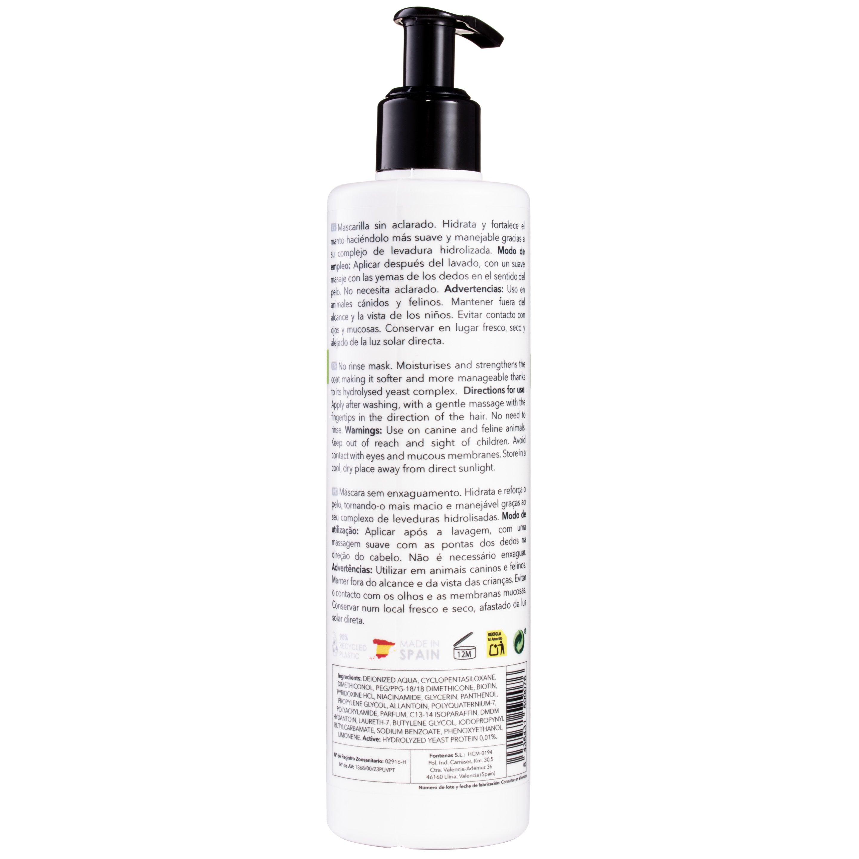 Apply after washing your pet, on damp or completely dry hair. Spread the mask evenly over the dog's coat, working gently with your fingertips. Do not rinse.