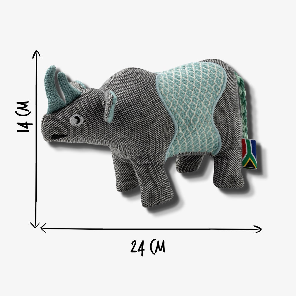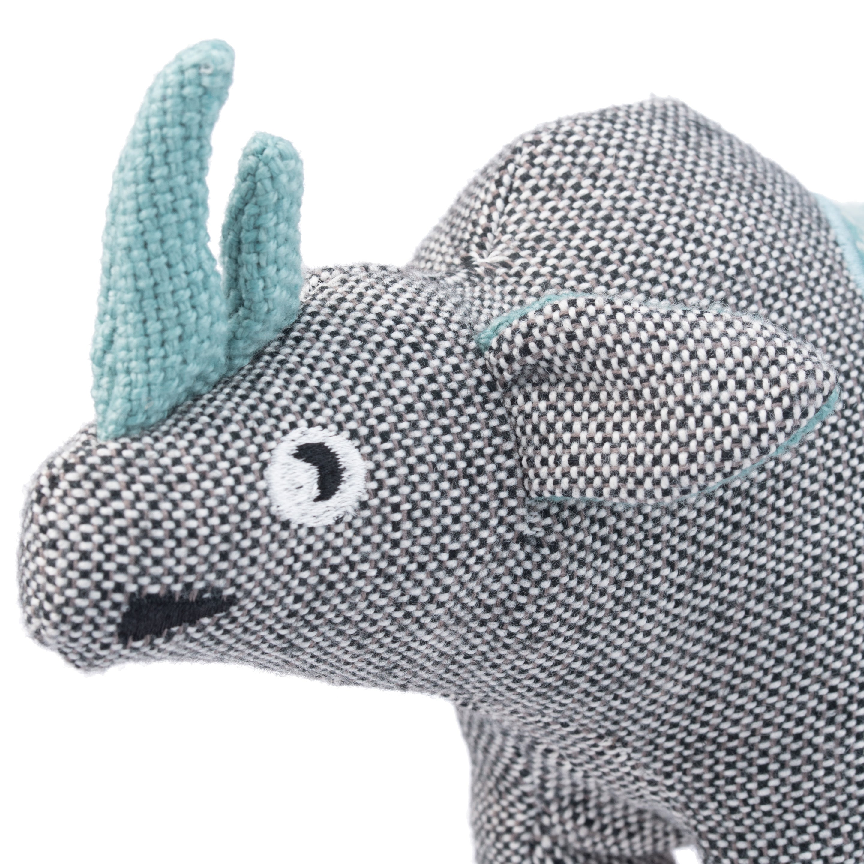 Resploot Cuddlers Black Rhino is a soft dog toy in the shape of a rhinoceros. Made from 100% recycled PET bottle materials, it features a unique natural rubber squeaker (plastic-free). Does your pooch enjoy cuddles, but are eco-friendly products and a sustainable lifestyle a priority? If so, you'll love the Resploot brand and the Cuddlers line of stuffed animals made from recycled materials. This line of cuddly toys features soft, generous padding, making them ideal for dogs who enjoy comfort and don't destroy their toys. The toy's outer fabric is tweed-like, but made with fibers from recycled PET, featuring a variety of weaves and decorative stitching. The label provides brief information about the African black rhinoceros. This fun dog plush toy is Resploot's contribution to raising awareness among pet owners about endangered species.