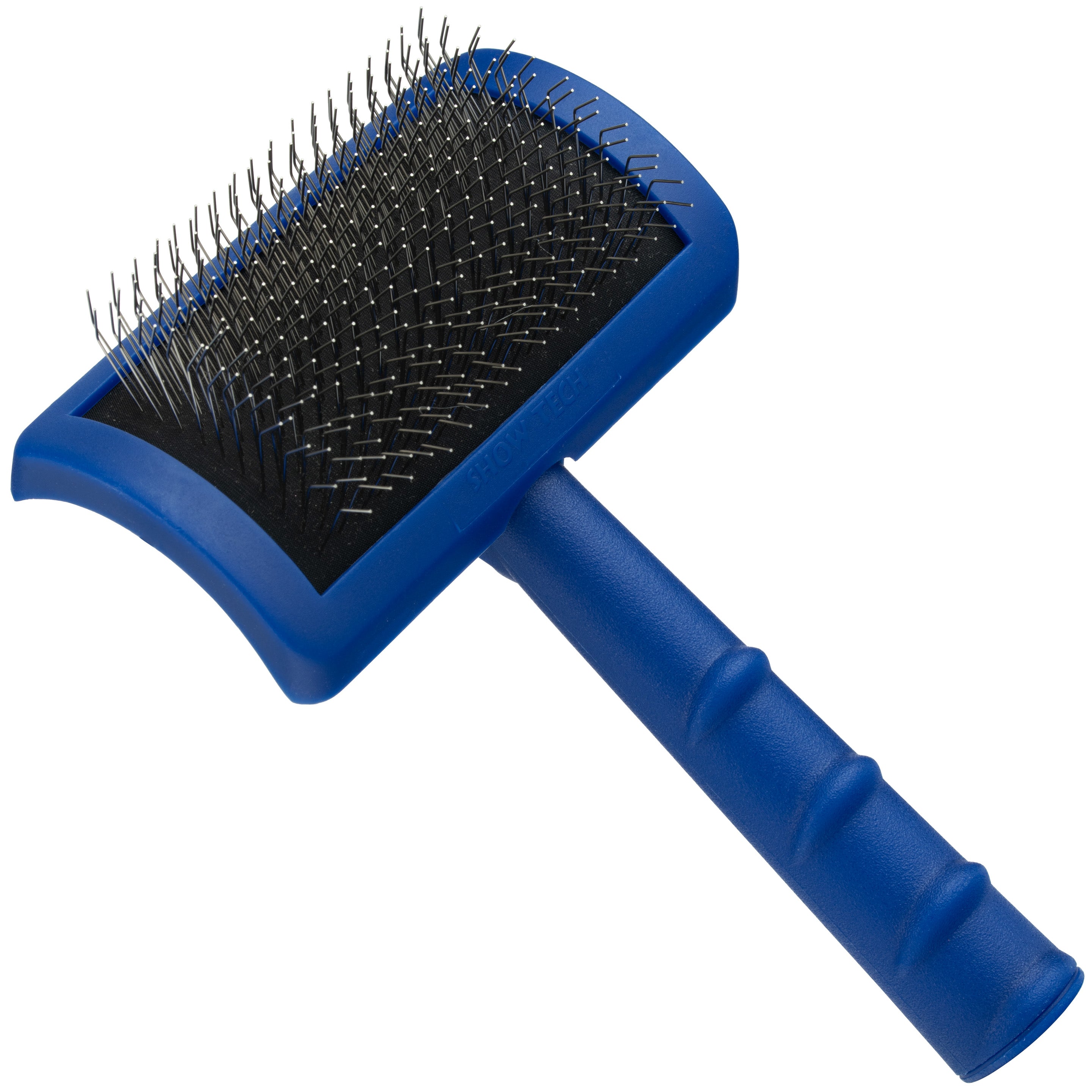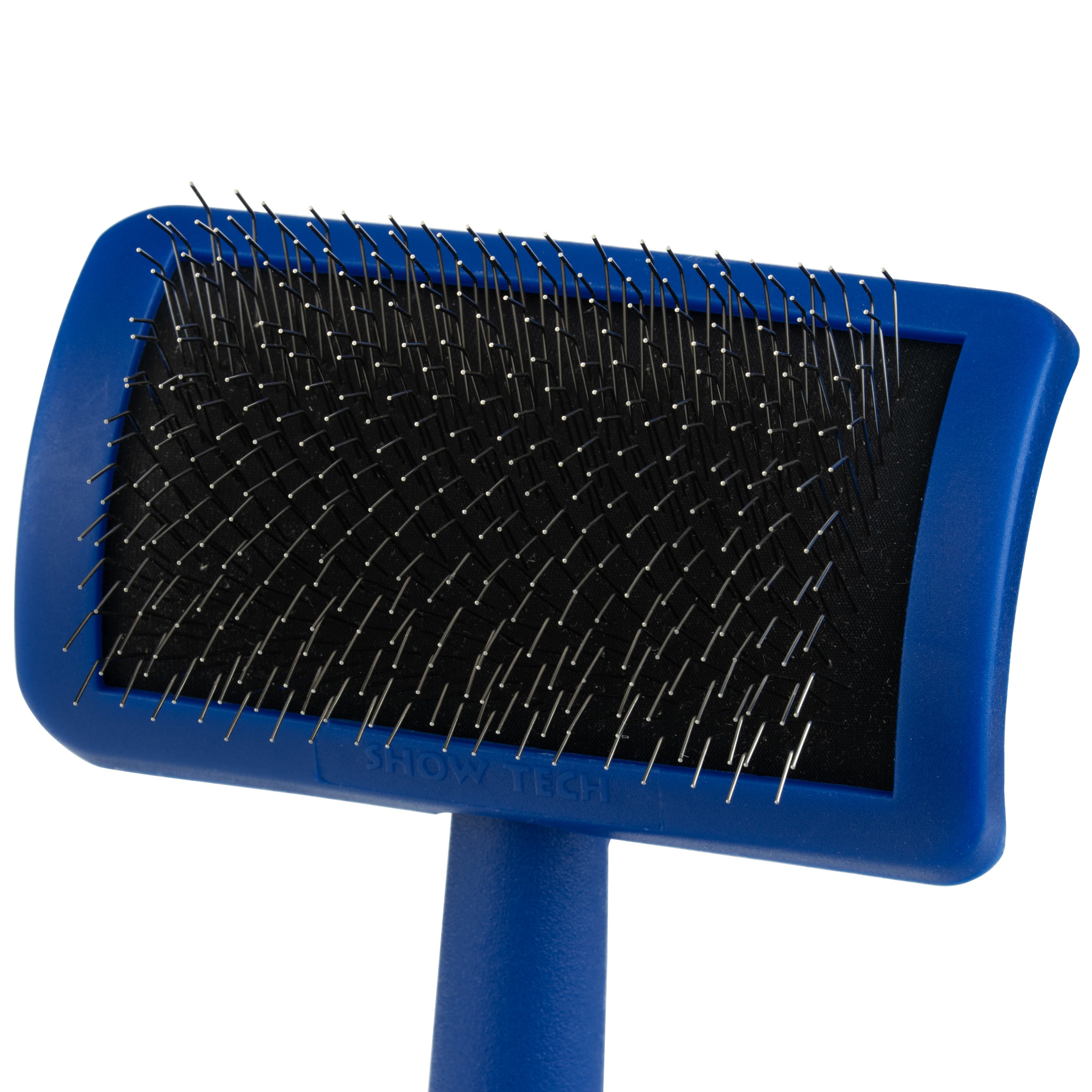 The Show Tech Tuffer is a medium-sized poodle brush designed for comfortable use with extra-long, curved needles for thorough detangling.