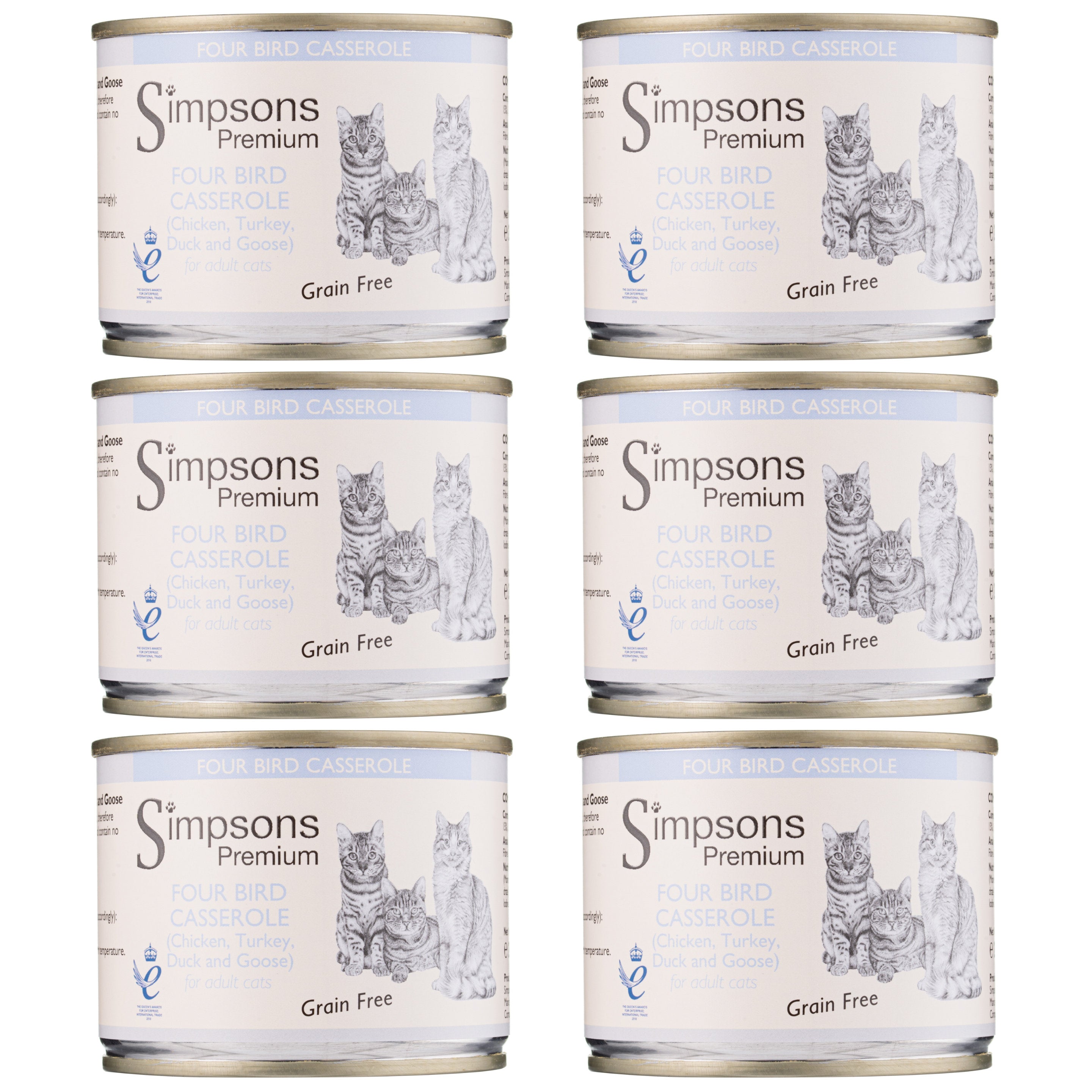 Simpsons Premium Cat Four Bird Casserole is a complete meal for cats, made with chicken, turkey, duck, and goose, ideal for cats with allergies or digestive issues.