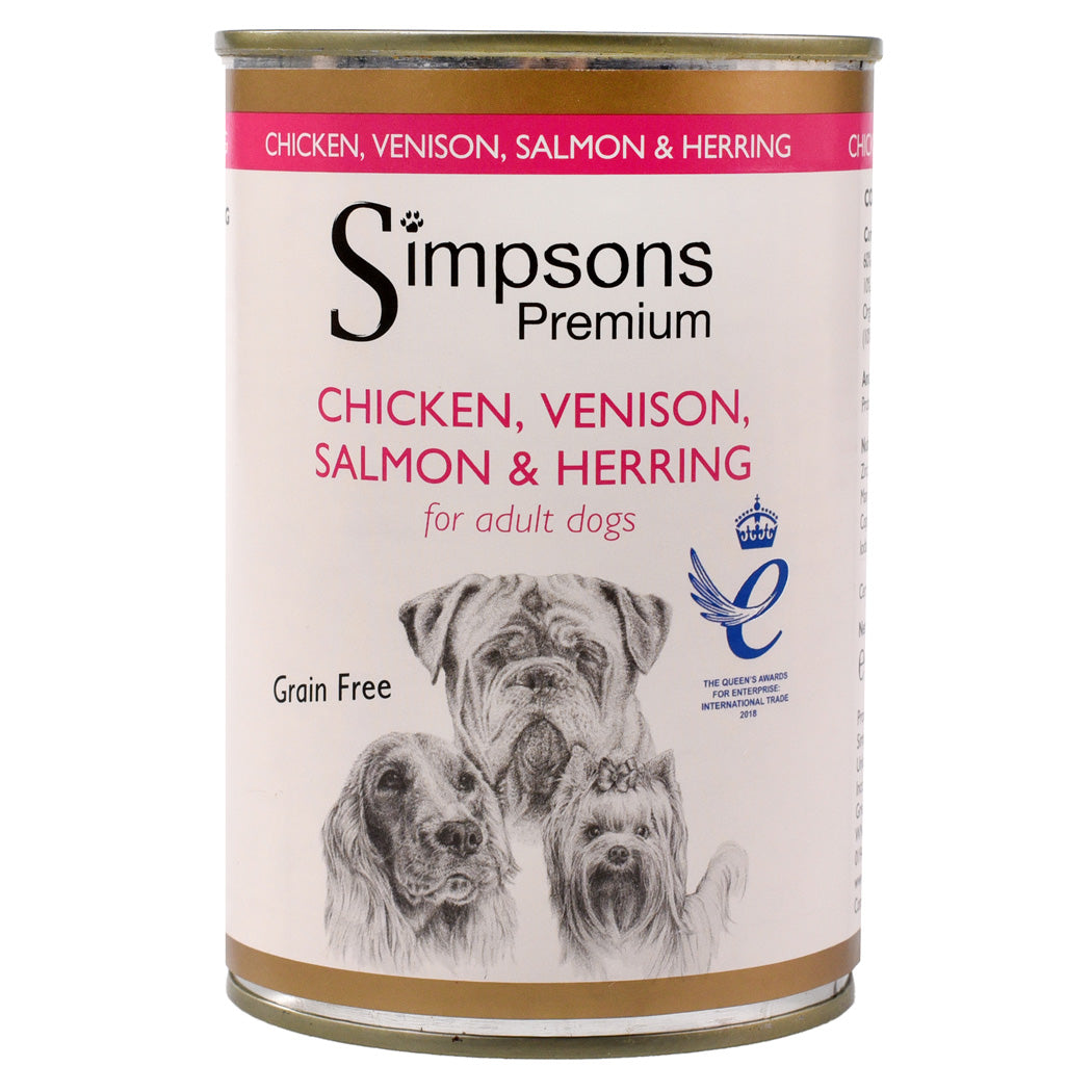 A complete meal for dogs, featuring chicken, venison, salmon, herring, and vegetables from organic farming, ideal for dogs with allergies or sensitive stomachs.