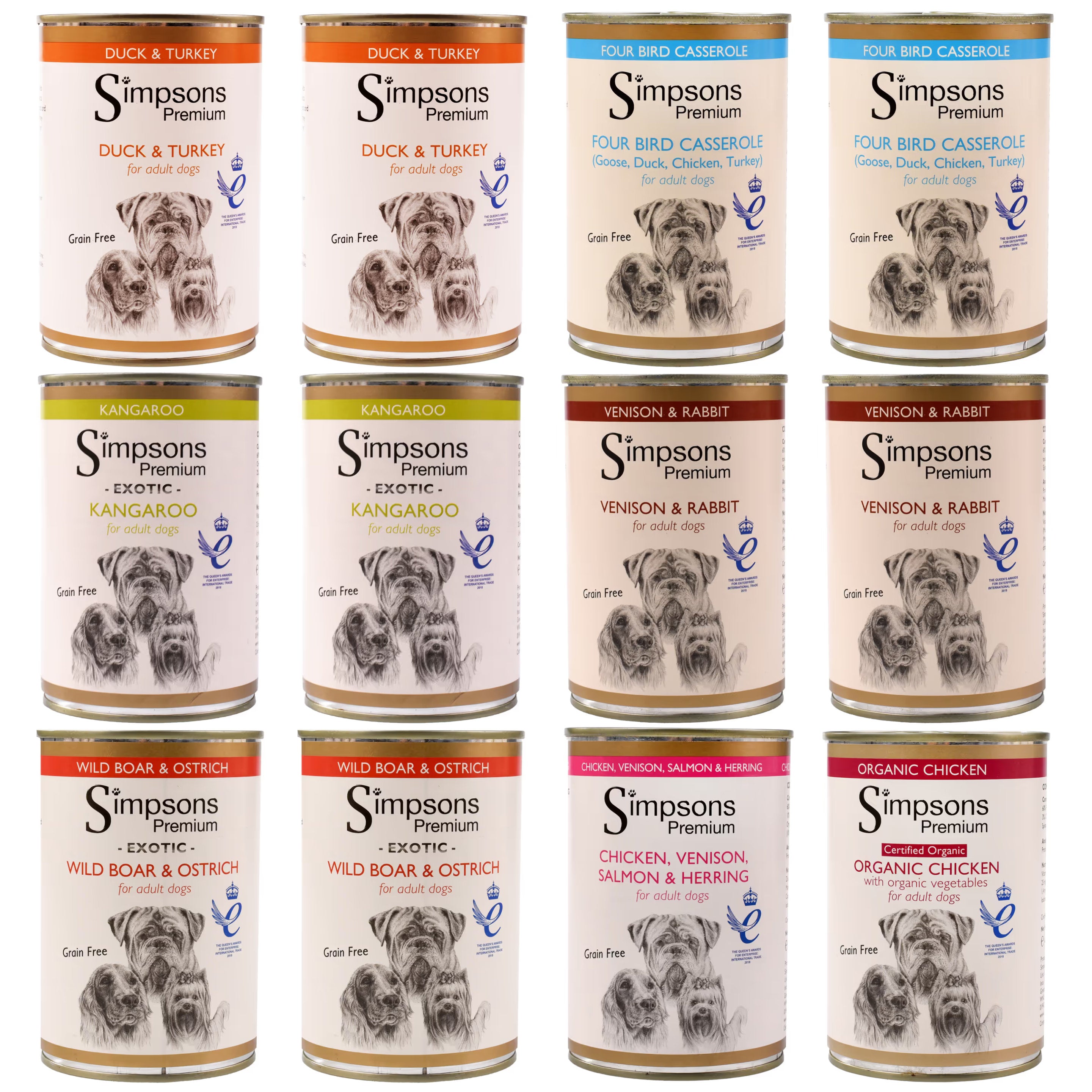 Simpsons Premium 12x 400g food set offers a variety of natural, grain-free meals suitable for all breeds of dogs, ideal for those with allergies or sensitive stomachs.
