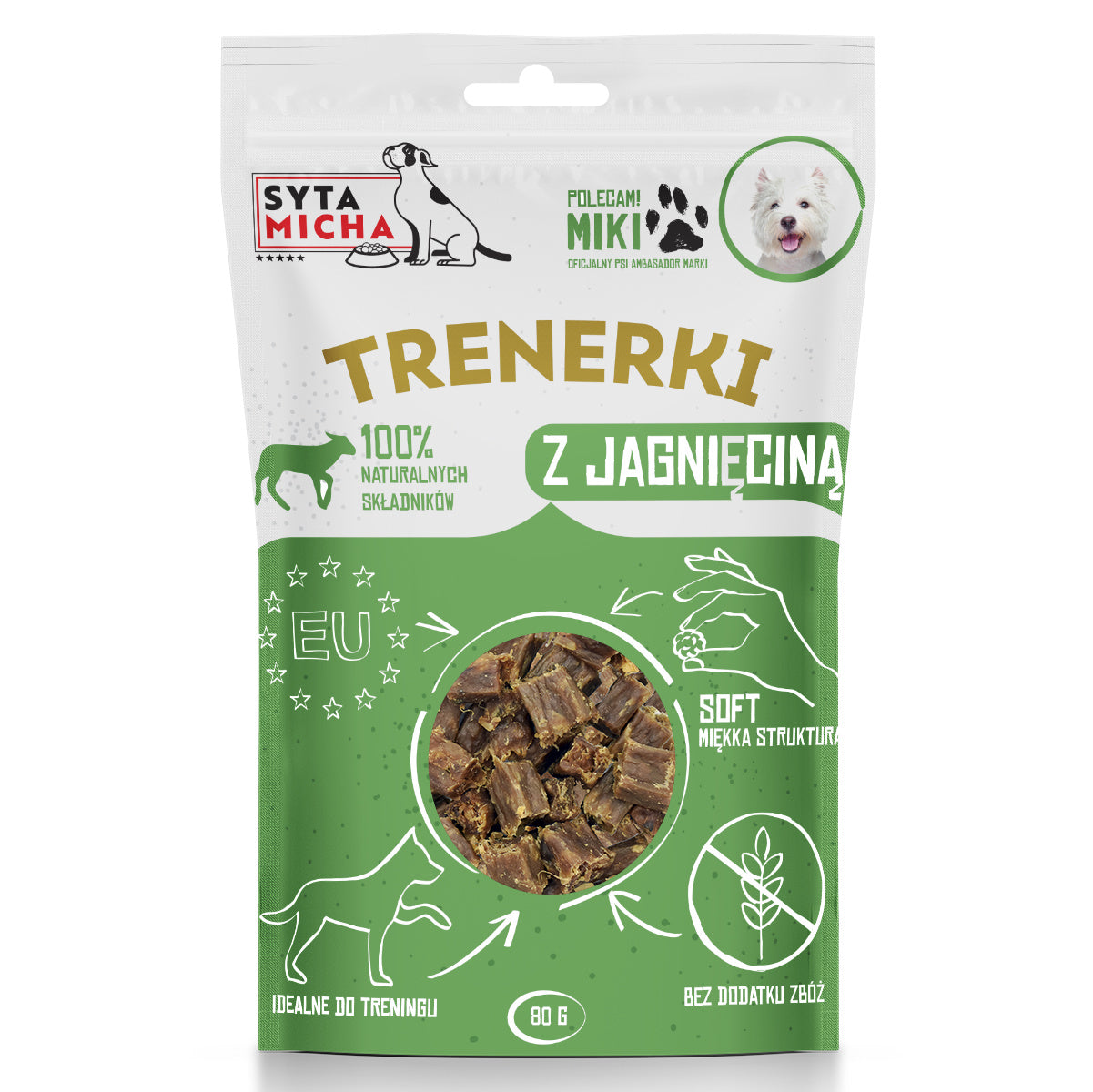 Aromatic training treats with lamb for puppies, adults, and seniors of all breeds. These mono-protein and grain-free treats will be loved by even the pickiest of dogs. They are free from corn, wheat, soy, artificial colors, and flavors. They are suitable for dogs with sensitive digestive systems or allergies. Lamb is a rich source of easily digestible protein, L-carnitine, which helps maintain a healthy body weight, and orotic acid, which has anti-cancer properties. These training treats are not only a tasty but also a healthy reward, containing vitamins A, C, and E to boost immunity, as well as calcium, phosphorus, and zinc for healthy joints and strong bones. Carefully selected ingredients ensure proper functioning of the nervous system and positively impact fitness and well-being during walks or training. Your pet will love these 100% natural, small and soft lamb trainers.