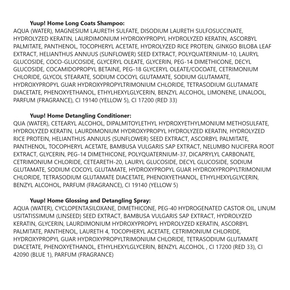 Yuup! Home Detangling Conditioner: Apply conditioner to damp, previously shampooed coat and leave on for a few minutes. Rinse with lukewarm water.