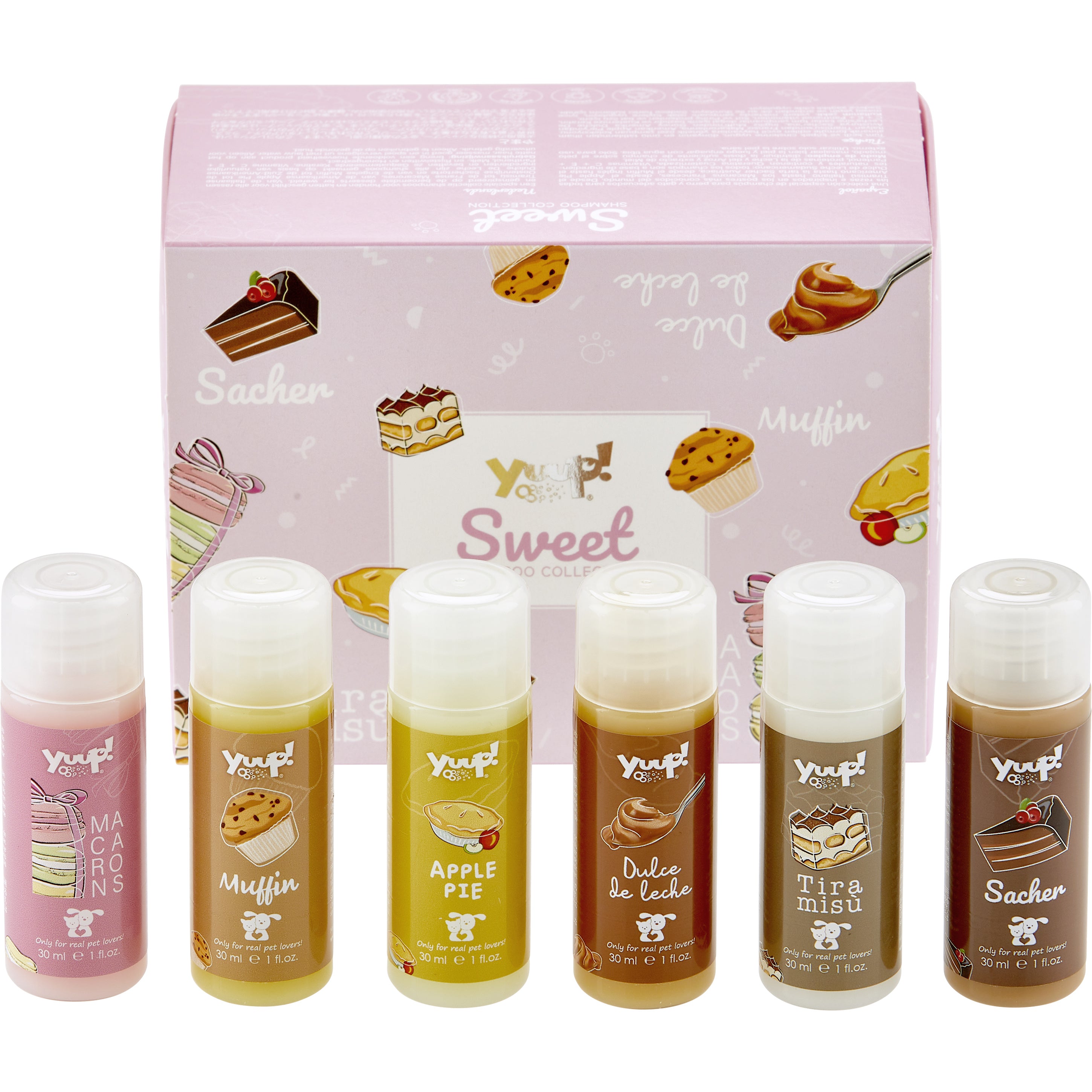 A set of six universal Yuup! Sweet Collection Shampoo Collection shampoos for dogs and cats. Inspired by the scents of the world's most famous desserts, the set includes shampoos in the following aromas: Italian Tiramisu, French Macaroons, American Apple Pie, Austrian Sacher Torte, English Muffins, and South American Dulce De Leche Caramel. This set makes an ideal gift for a dog mom. It's also a great solution for those traveling with their pet: the small packaging of each shampoo means it won't take up much space in your luggage and will always be on hand in case of a "dirty" accident.